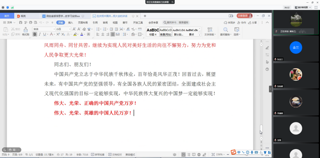 2021年7月18月,按照暑假党史学习计划,测绘学院教师第二支部通过腾讯会议召开党史学习研讨会,深入学习《习近平总书记在庆祝中国共产党100周年庆祝大会的讲话》。会议由党支部书记黄铁兰同志主持,第二支部全体党员参加。