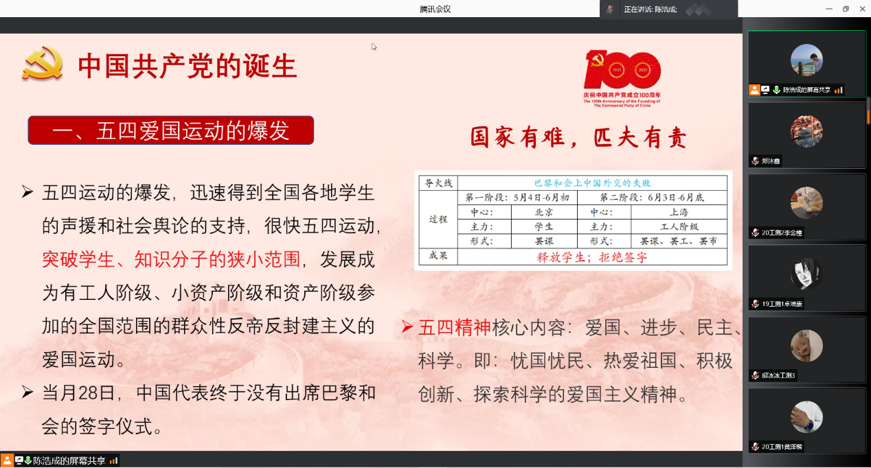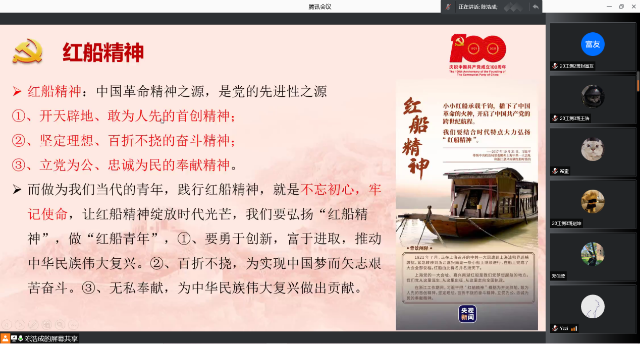 陈浩成首先带领全体同学们学习了习近平总书记在庆祝中国共产党成立100周年大会上的重要讲话,讲话全面回顾一百年来我们党围绕实现中华民族伟大复兴,团结带领中国人民开辟的伟大道路、创造的伟大事业、取得的伟大成就,庄严宣告我们实现了第一个百年奋斗目标,在中华大地上全面建成了小康社会,深刻总结了伟大建党精神,系统阐述了以史为鉴、开创未来的“九个必须”。在讲话中,习近平总书记寄语青年,要以实现中华民族伟大复兴为己任,要增强做中国人的志气、骨气、底气,不负时代、不负韶华、不负党和人民的殷切期望!