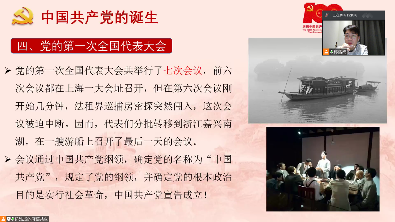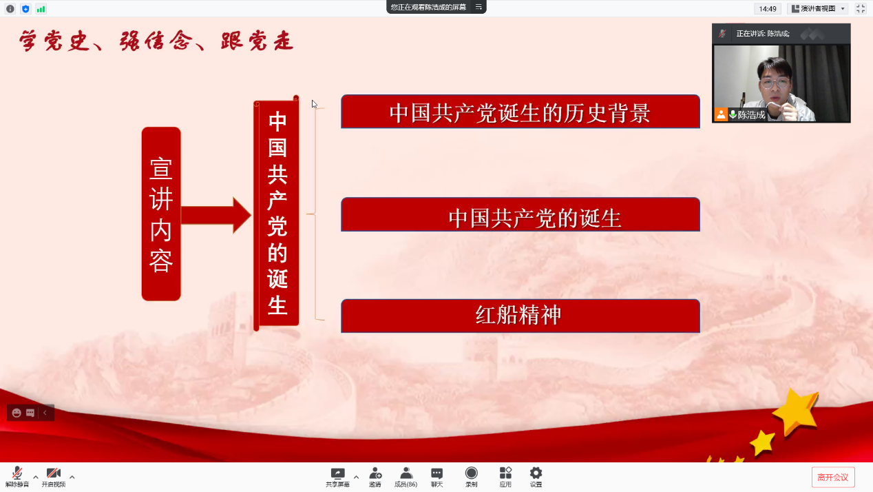 随后,陈浩成以《中国共产党的诞生与红船精神》为主题,按中国共产党诞生的历史背景、中国共产党的诞生、和红船精神,三大部分进行了党史宣讲,在宣讲中,陈浩成向同学们讲述了1840年鸦片战争后的中国和国际环境、1919年五四爱国运动爆发和马克思主义在中国的传播以及在各地建立了党的早期组织,最终在小小的红船上完成了党的第一次全国代表大会的闭幕,通过回顾党史故事重温了国家的危亡之际、中国共产党诞生的艰难历程,同时带领同学们深入学习了因红船建党而形成的勇于创新、勇于奋斗、乐于奉献的红船精神。他讲到,红船精神是我们党的建党之源,让红船精神绽放时代光芒,当代青年要弘扬“红船精神”,做“红船青年”。并且在最后寄语同学们:党的第一个百年奋斗目标的实现我们是见证者,第二个百年奋斗目标我们要成为建设者,肩负起实现中华民族伟大复兴的使命,为实现中华民族伟大复兴不懈努力!