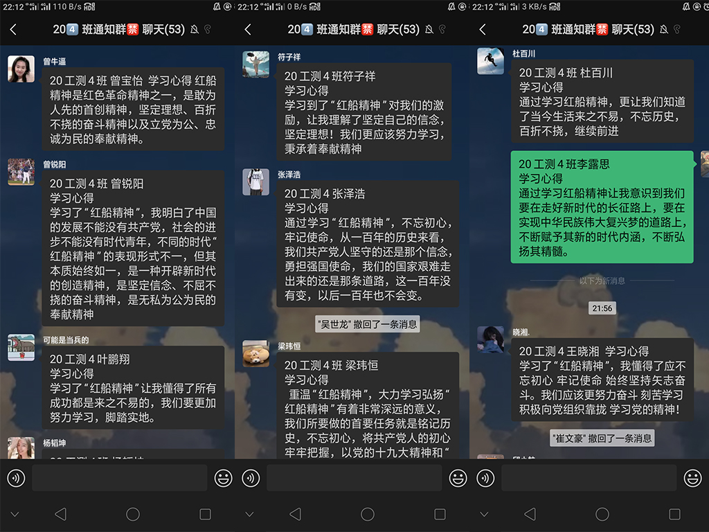 在本次宣讲结束后,2020级工程测量技术4班、5班分别在本班微信群组织开展了讨论,同学们积极的分享了自己的学习心得。