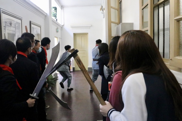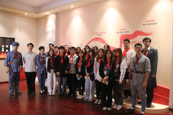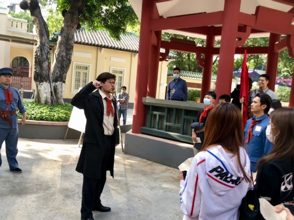 话剧《1927红色广州》以广州起义纪念馆为现场舞台背景,以史为轴,梳理广州起义事件的脉络,结合大量详实的历史资料,采用“博物馆+话剧”的演员观众现场互动新模式,带领大家重温1927年广州起义的峥嵘岁月。这是一场话剧艺术与党史宣教的完美融合,是一次真正的沉浸式体验。跨过历史的长河,在广州起义的历史原地——原广州苏维埃政府所在地(广州起义纪念馆,即广州公社旧址),同学们通过演员们的亲身演绎,仿佛穿越时空,和先烈们隔空对话,一同感受了那个风雨激荡的年代。回到1927年,我们系上红布带,拿起武器,参与其中,我们是观众,又不仅是观众。