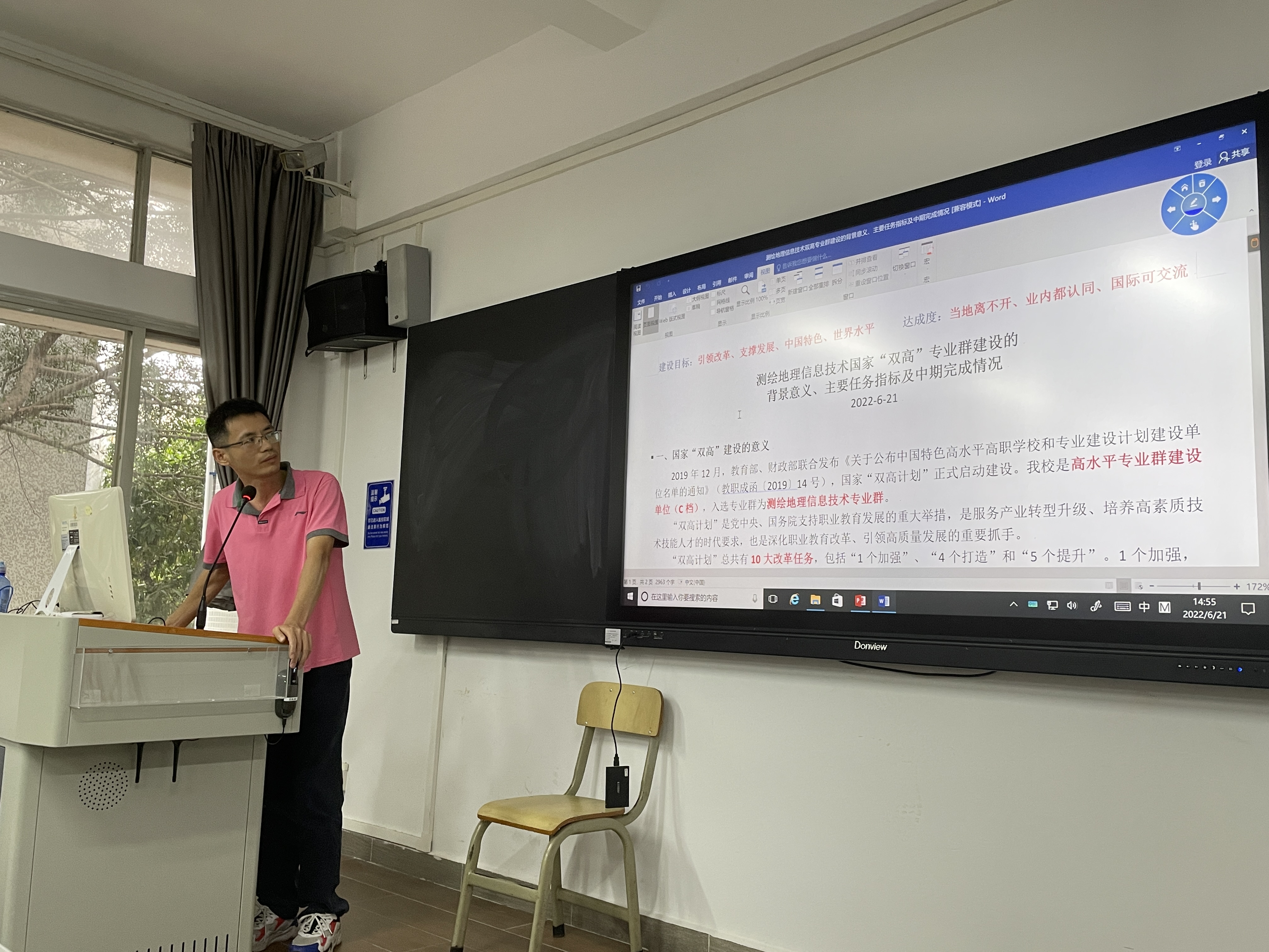 学院地理信息系主任黄铁兰老师对学院全体教职工进行了“双高”建设的知识普及以及国家“双高”建设的意义,同时介绍了测绘地理信息技术国家“双高”专业群的主要建设任务和中期建设的成效。强调了“双高”计划是指中国特色高水平高职学校和专业建设计划,是中国共产党中央委员会和中华人民共和国国务院为建设一批引领改革、支撑发展、中国特色、世界水平的高等职业学校和骨干专业(群)的重大决策建设工程,亦是推进中国教育现代化的重要决策。我校入选的是高水平专业群建设单位(C档),入选的专业群为测绘地理信息技术专业群,并且要以引领改革、支撑发展、中国特色、世界水平作为建设目标,以当地离不开、业内都认同、国际可交流作为达成要求。