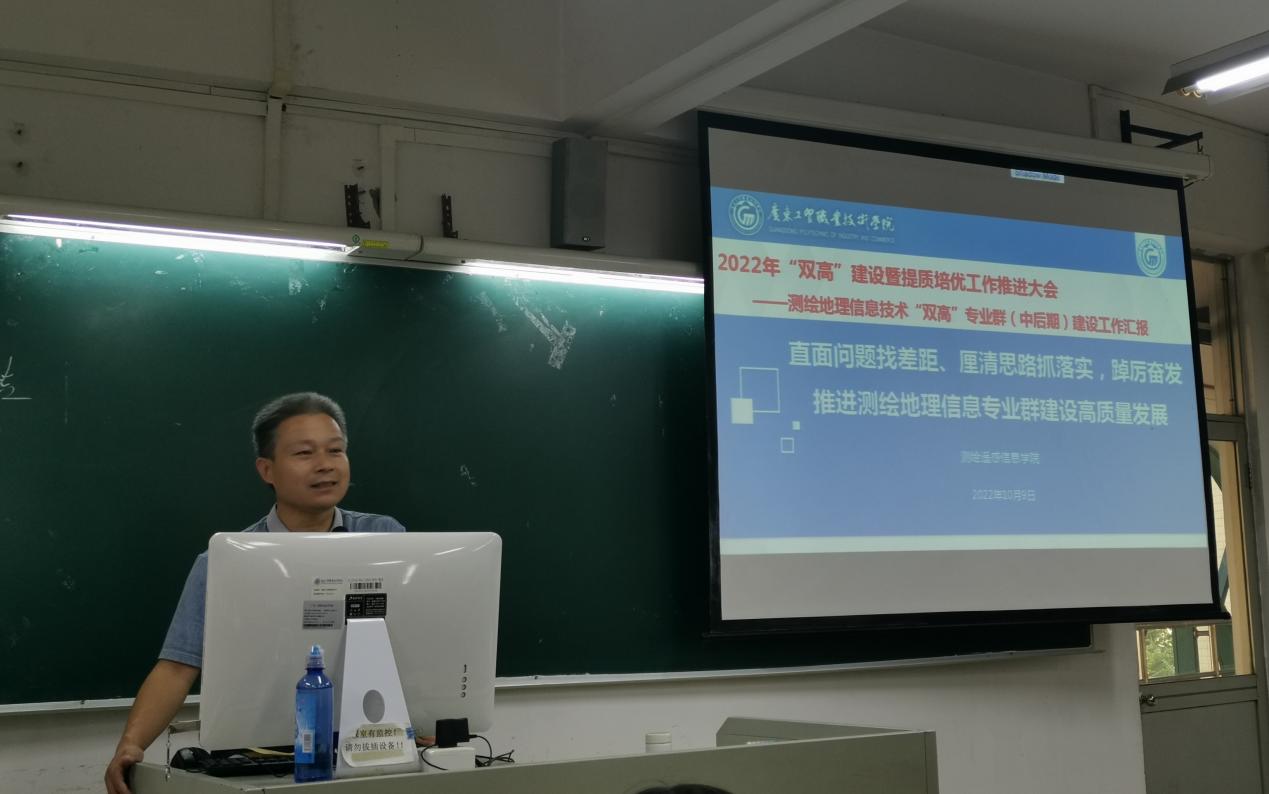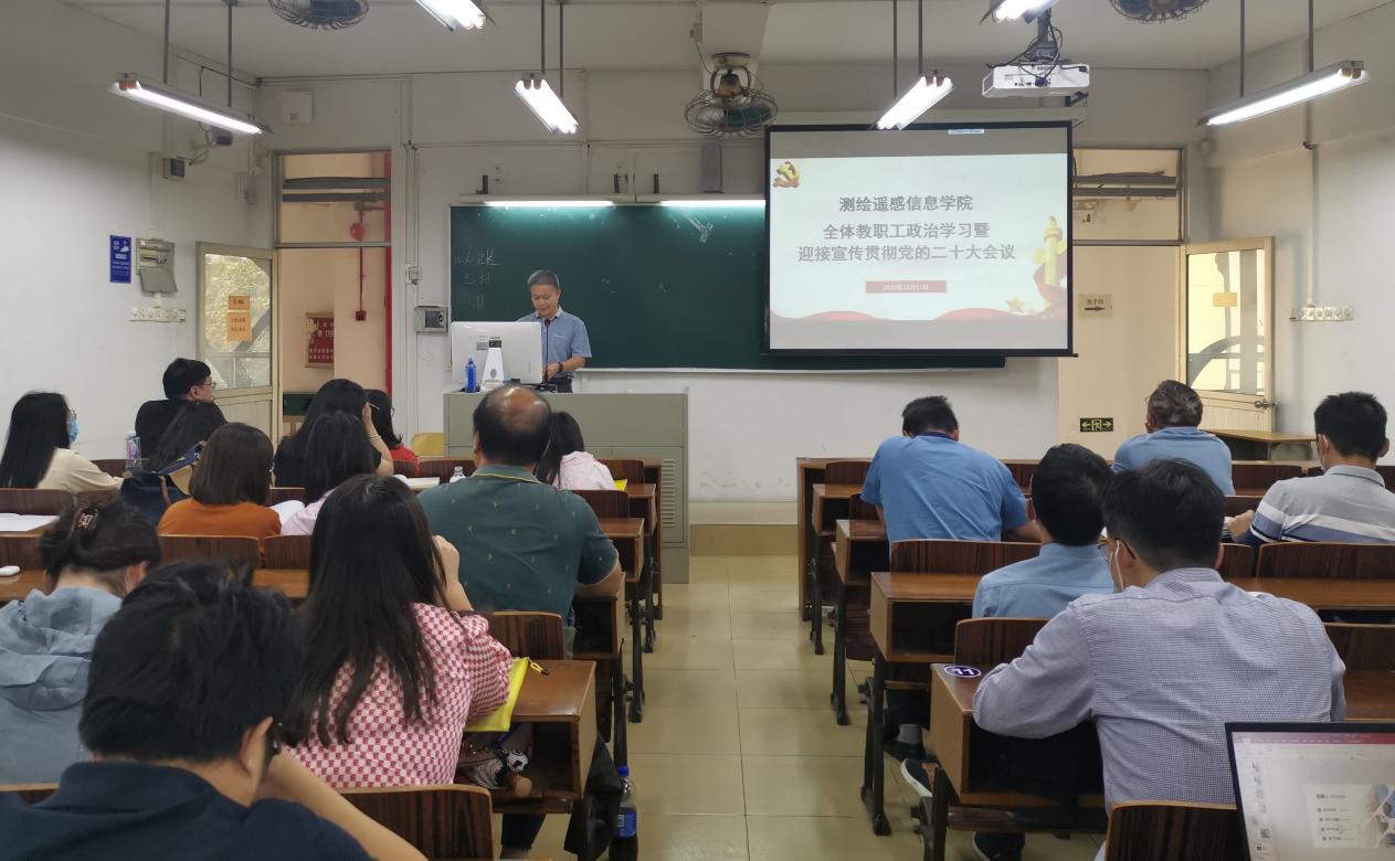 为认真学习贯彻习近平新时代中国特色社会主义思想,深入贯彻落实习近平总书记关于教育的重要论述及党中央、国务院重大决策部署,持续推进政治理论学习常态化和规范化,贯彻落实广东省第十三次党代会精神,坚持不懈把全面从严治党向纵深推进,深入学习《习近平谈治国理政》第四卷,严格纪律教育学习和师德师风建设要求,全面推进“双高计划”专业群建设工作,以实干实绩迎接党的二十大召开。10月11日,测绘遥感信息学院在天河校区西区综合楼406召开全体教职工政治学习会议暨迎接宣传贯彻党的二十大,学院党总支书记兼院长速云中主持会议并组织政治学习,学院全体教职工参加会议。