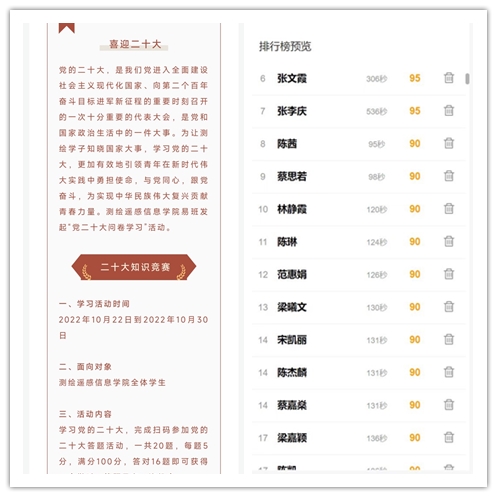为深入学习宣传贯彻党的二十大精神,近日,测绘遥感信息学院组织开展了党的二十大精神知识竞赛活动。活动通过易班开展,10月22日至30日期间,共有869人参与了线上答题。