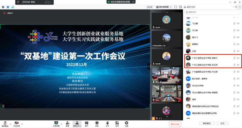 2022年11月24日,“全国大学生创新创业就业服务基地”和“全国大学生实习实践就业服务基地”(简称“双基地”)第一次工作会议在江西软件职业技术大学井冈山数字经济产业学院举办。本次会议由高校毕业生就业协会主办,邀请了江西省委教育工作委员会、江西省教育厅、新华网、教育部职业教育发展中心、中国职业技术教育学会、高校毕业生就业协会等政校行企相关代表以及来自全国各地入选“双基地”的百余所高校和企事业单位代表以线下线上并行的方式参加了会议。学校测绘遥感信息学院教师吴献文、张玉荷作为学校代表以线上方式参加了会议。