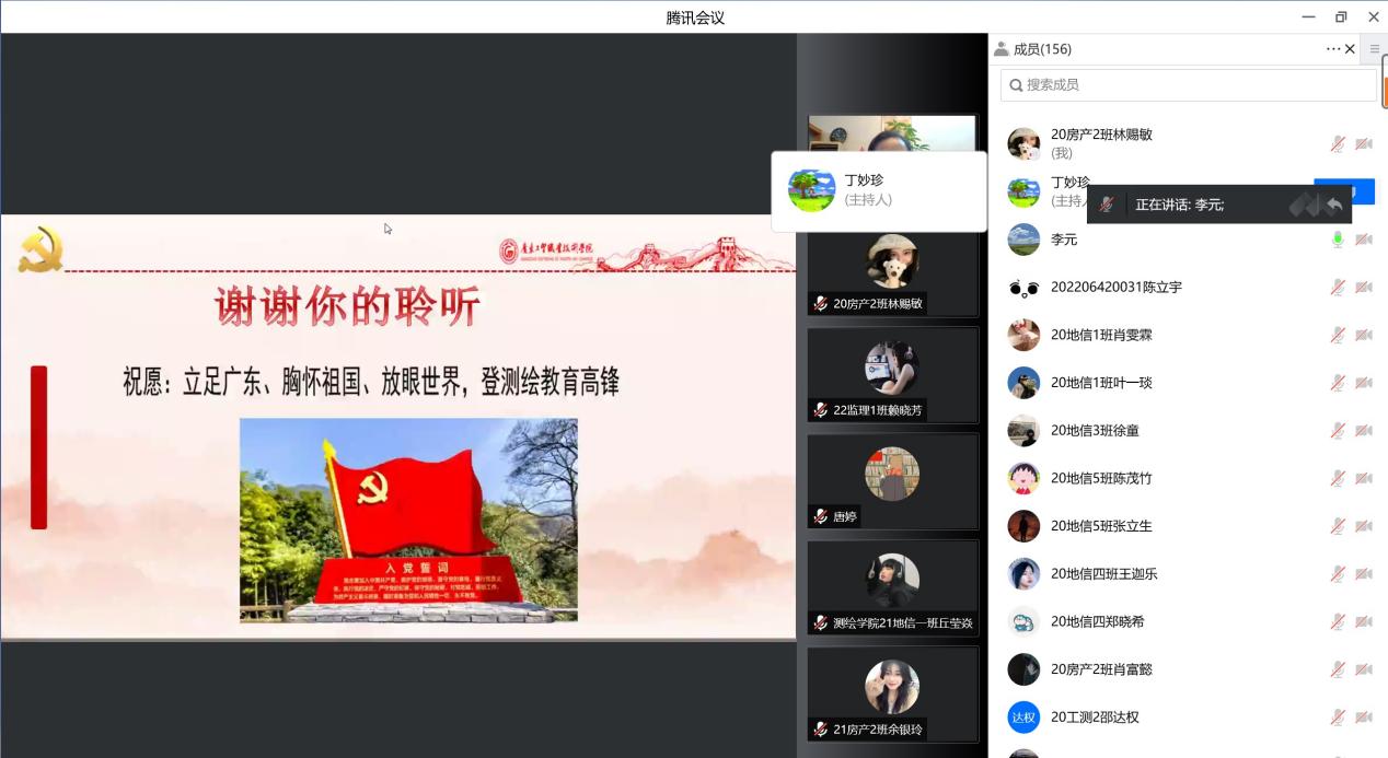 最后,测绘遥感信息学院党总支副书记李元进行了总结,同时希望将来有更多的机会邀请退休教师为学院师生开展思想政治教育。并鼓励学院师生脚踏实地,在学思践悟中进一步坚定理想信念,切实把党的二十大精神落实到学习生活工作中,在“自信自立自强”中再创新高,为学校“双高”计划建设贡献力量,全力助推学院教育事业高质量发展。