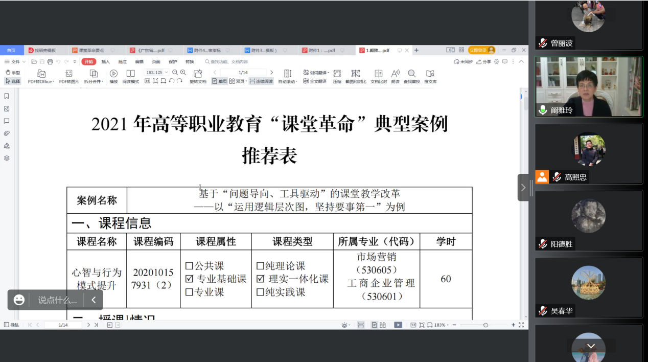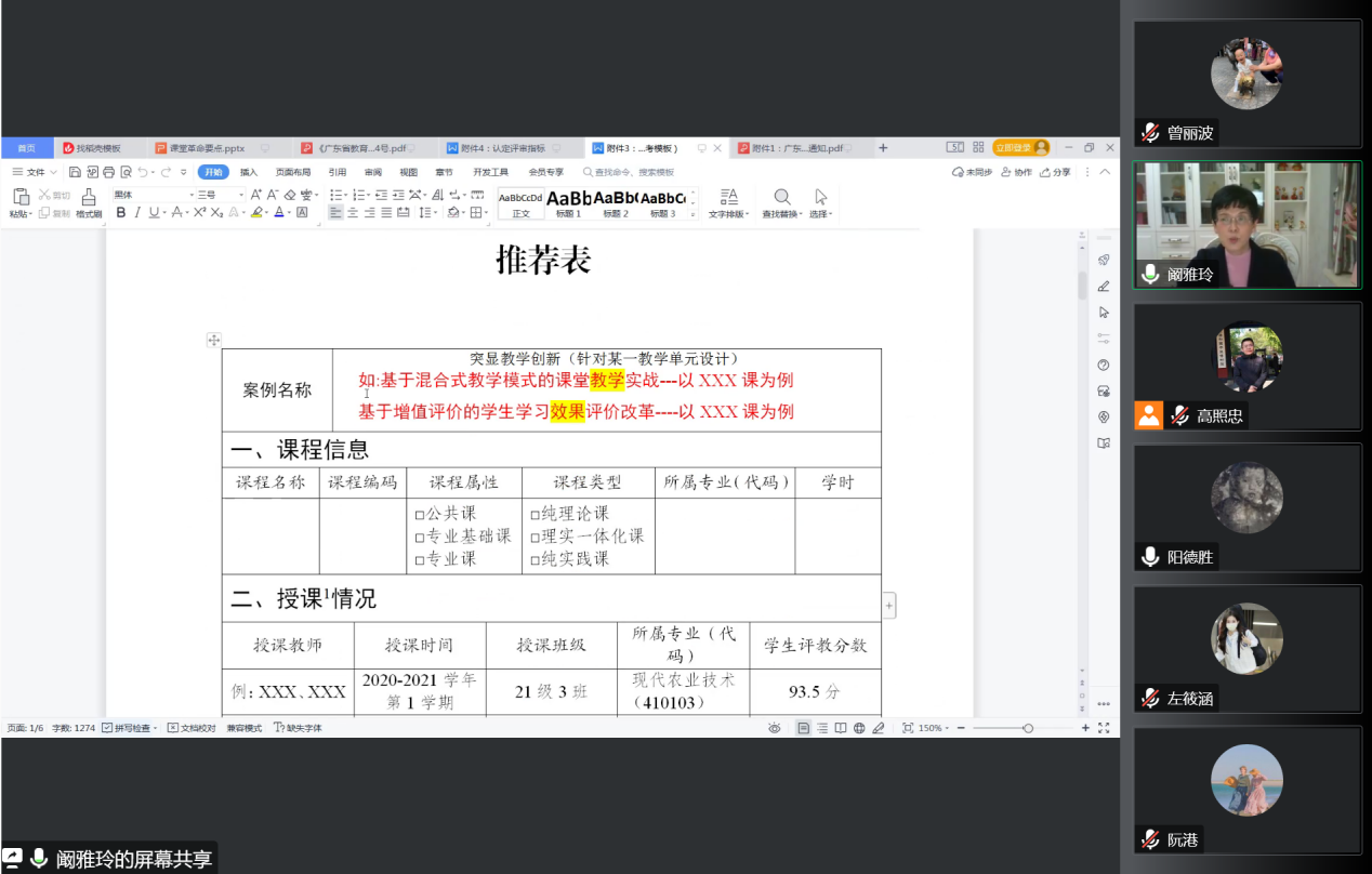 会议开始,测绘遥感信息学院副院长高照忠首先对阚雅玲教授进行了介绍,阚雅玲是国家万人计划教学名师,黄炎培职业教育杰出教师。主持的《心智与行为模式提升》获教育部课程思政示范课程,同时获教育部课程思政教学名师和教学团队,历年来已获得多项重要教学成果。接下来,阚雅玲教授首先从解读“广东省教育厅关于做好2022年高等职业教育“课堂革命”典型案例认定工作的通知”文件;随后阚雅玲教授对认定推荐表中各项内容如何填写进行了详细讲解;最后,她分享了个人申报的“课堂革命”典型案例—“课堂革命”典型案例的探索和实践,依托实际案例,从摘要、解决的问题、问题解决策略、实施效果、创新与示范、反思与改进六个方面再次详细讲解了如何建设“课堂革命”典型案例。