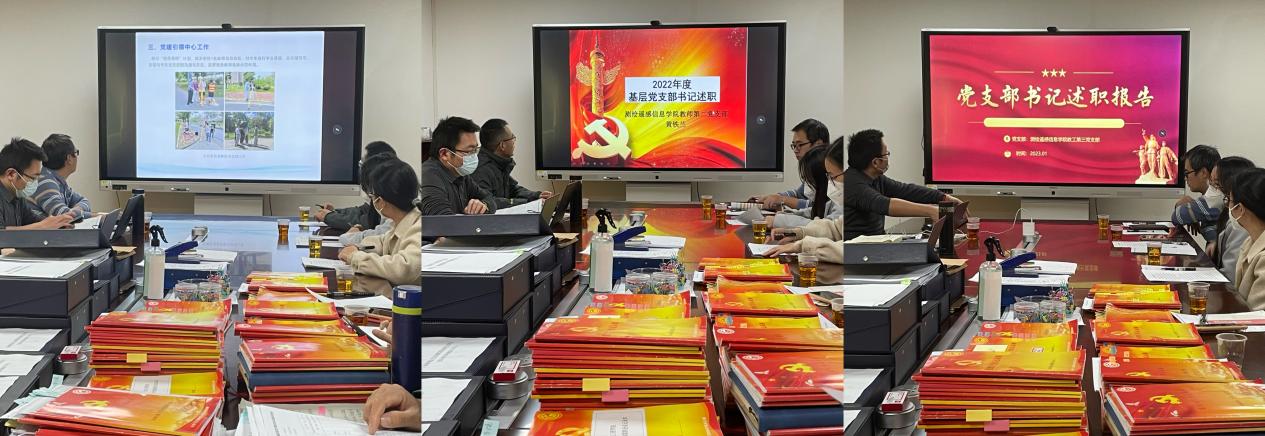 教师党支部书记侯林锋、黄铁兰、高照忠依次进行述职,分别围绕履行党建主体责任、党支部政治理论学习、意识形态责任落实情况、党日活动开展情况、党支部工作与学科建设、学生培养等中心工作的融合度、党员参与防疫情况、党建工作成效与不足及整改措施等方面进行述职汇报。