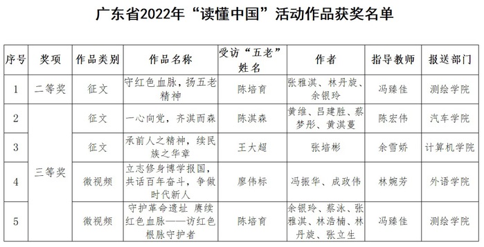 近日,广东省教育厅公布了广东省教育系统关工委2022年“读懂中国”活动评选结果。此活动充分发挥五老亲历者、见证者、实践者的优势,引导广大青年学生赓续红色血脉、弘扬优良传统,坚定信仰、勇毅前行,在新时代新征程上贡献青春力量,以实际行动践行党的二十大精神。