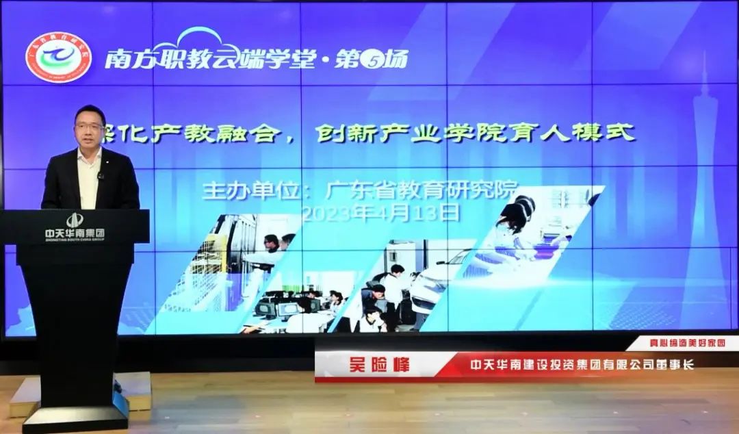 中天华南建设投资集团有限公司董事长吴险峰围绕中天华南集团与广东建设职业技术学院共建产业学院,开展学徒培养的育人过程,分享了企业发挥技能人才培养的主体作用,校企依托广建中天学院明确学徒培养目标、明确学徒培养分工等的经验与做法。