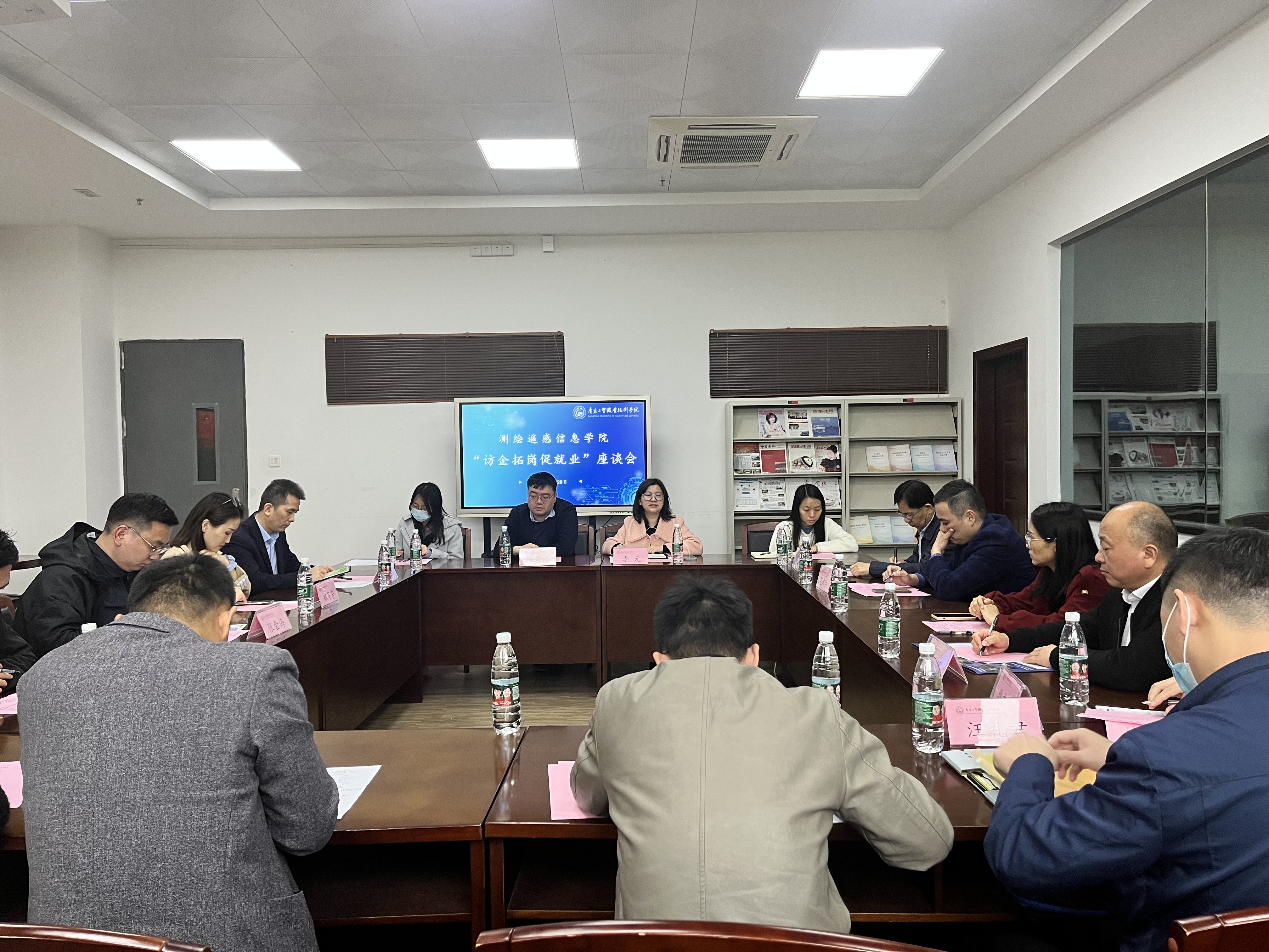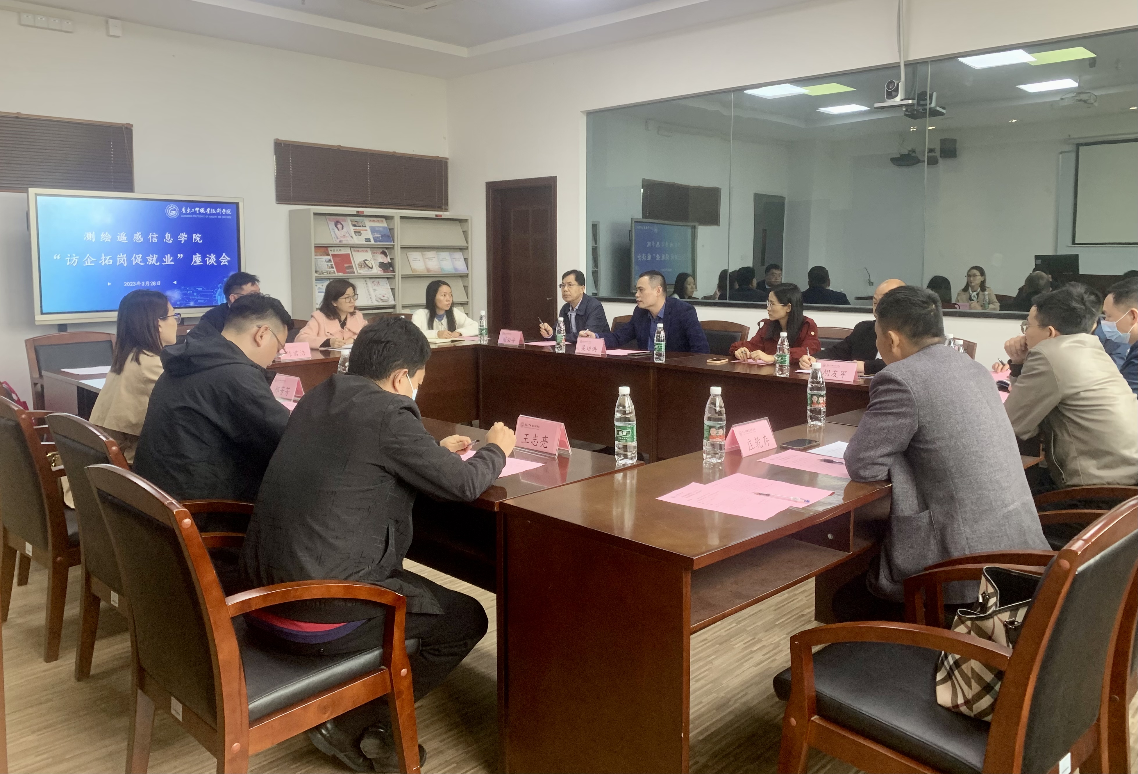 为落实教育部关于访企拓岗促就业专项行动工作要求,同时结合教育部供需对接就业育人项目内容,深化校企合作,助力2023届毕业生顺利充分就业,3月28日下午,测绘遥感信息学院在明德楼1-214召开“访企拓岗促就业”校企交流座谈会。测绘遥感信息学院党总支副书记李元、学工办主任陈君浩、学生第一党支部书记张玉荷、学生第二党支部书记冯臻佳以及辅导员等教师代表共同参会。广东省地质测绘院分院长吴培洪、总工程师谢荣安、 全成地信集团股份有限公司院长王志亮、中煤江南建设发展集团有限公司(广东煤炭地质二0一勘探队)党委书记胡友军、 广州鼎晟信息技术有限公司总经理庄乾存、广州继善建筑技术有限公司综合部经理王耿青、广东新禾道信息科技有限公司人事副经理郑芳芳、 广州融亿科技有限公司总经理汪礼君、广州乐居工程咨询有限公司张金海总监、武汉智图科技有限责任公司总经理魏东旭和广州欧徕测绘技术有限公司总经理尉永平等10家单位领导和代表出席了本次会议。会议由李元主持。
