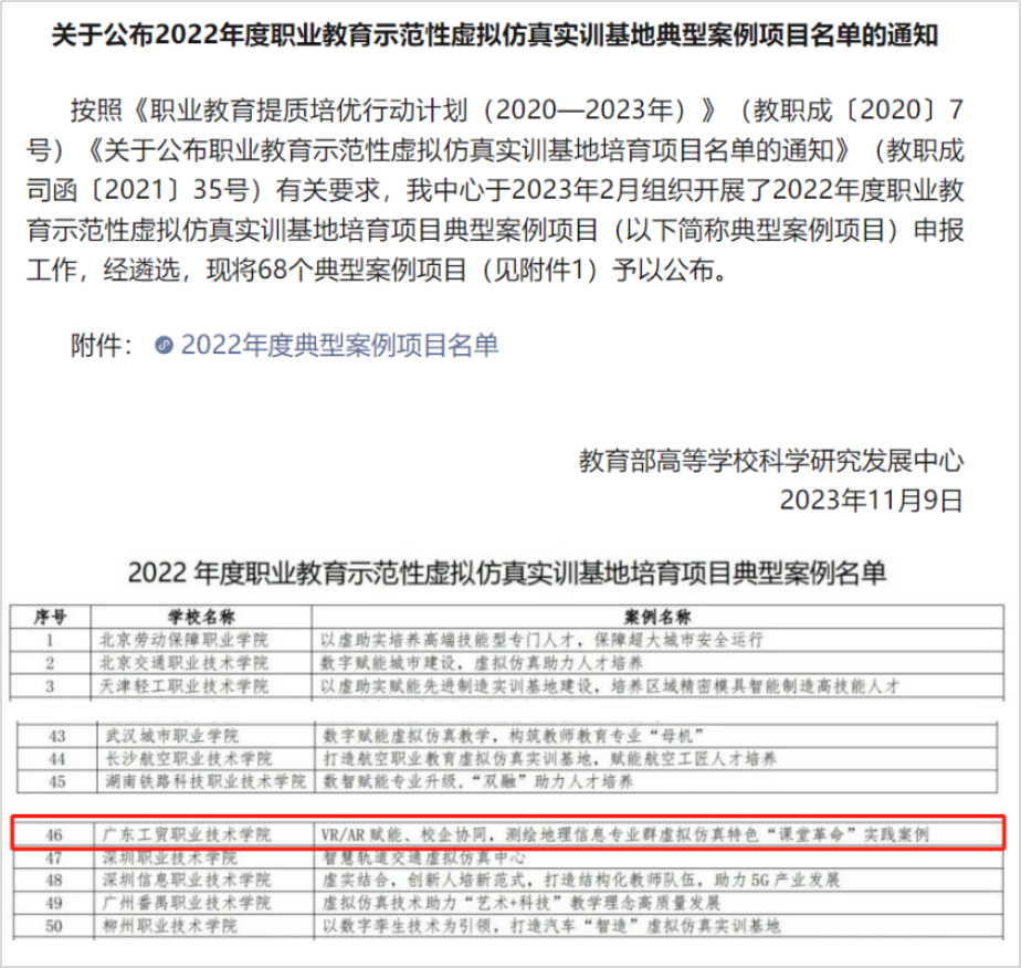 2023年11月9日,教育部高等学校科学研究发展中心对2022年度教育部职业教育示范性虚拟仿真实训基地典型案例名单进行了公示,在全国215个教育部虚拟仿真基地培育单位和200多省虚拟仿真实训基地立项学校提交的案例中,只有68个典型案例通过了本次遴选公布。我校测绘地理信息技术虚拟仿真实训基地典型案例以广东省第一的成绩通过遴选公布,深职院、深信息、番职院分列第二至四位。