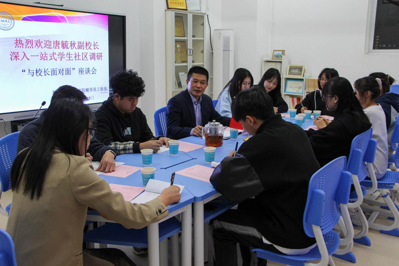 为扎实落实三全育人工作,推进学校一站式学生社区综合管理模式工作以及校领导进驻学生社区工作机制,践行“以学生为中心”的理念,充分了解学生的学习、生活现状以及相关诉求,2023年11月18日晚,学校党委委员、副校长唐毓秋深入学生社区,在白云校区16栋10楼辅导员工作室与测绘遥感信息学院10名学生代表开展以“共话青春成长,共叙使命担当”为主题的“与校长面对面”座谈交流活动,会议由测绘遥感信息学院辅导员吴艳主持。