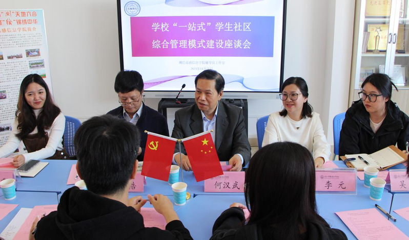 为扎实推进学校一站式学生社区综合管理模式建设,进一步提升学校管理育人、服务育人的针对性与实效性,增强广大学生参与学校民主管理的主人翁意识,倾听学生心声,解决学生问题,服务学生发展。11月21日下午,学校党委副书记、校长何汉武,党委委员、校长办公室主任吴浩莅临测绘遥感信息学院辅导员工作室调研“一站式”学生社区建设工作,切实解决学生的实际问题,推进学校事业高质量发展。会议由测绘遥感信息学院党总支副书记李元主持,辅导员罗小霞、吴艳以及来自大一、大二和大三三个年级的8名学生代表参加。