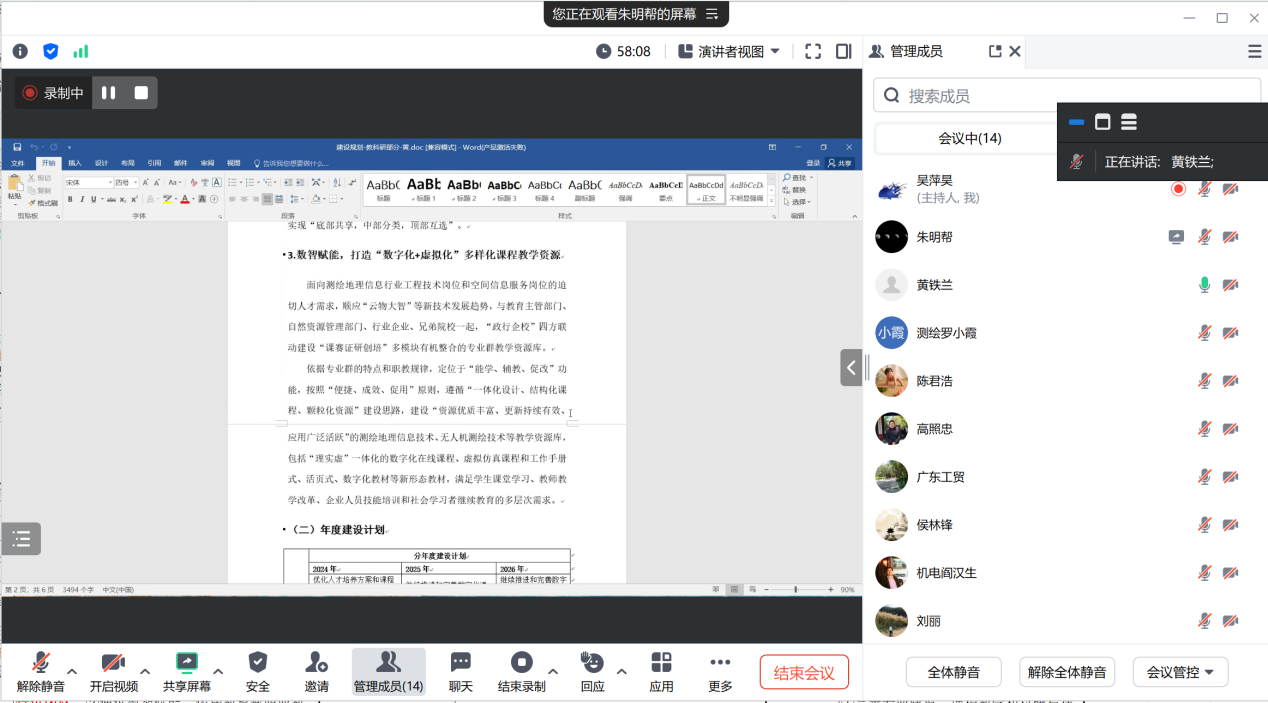 然后,测绘国家教师创新团队建设小组组长分别汇报各小组建设内容及分年度规划。黄铁兰重点汇报了教科研组在课程体系建设、科学研究等方面的建设思路和举措;侯林锋汇报了共同体建设组团队协作共同体建设和社会服务等方面的建设路径;刘丽从建设目标、分年度建设规划汇报了教师教学能力提升组在教师能力提升、模块化教学模式等方面的建设内容;陈君浩汇报了国际交流与成果推广组的建设内容,以及当前特色创新及成果推广方面的进展。