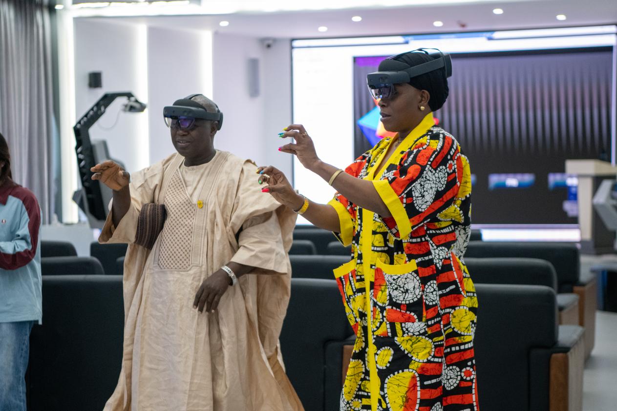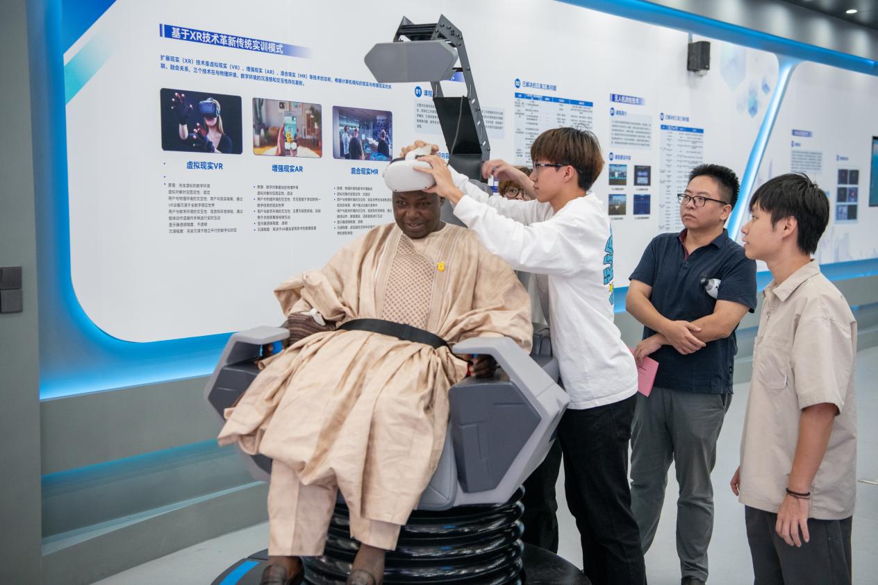 随后,Kabir先生一行在对外交流部伍炜勤部长、测绘遥感信息学院李元书记、地信系副主任朱腾的陪同下参观了测绘地理信息国家职业教育虚拟仿真示范基地,体验了虚拟仿真教学设施,0key-Uche N. 0lachi女士和Kabir先生不断赞叹虚拟仿真教学带来的震撼。