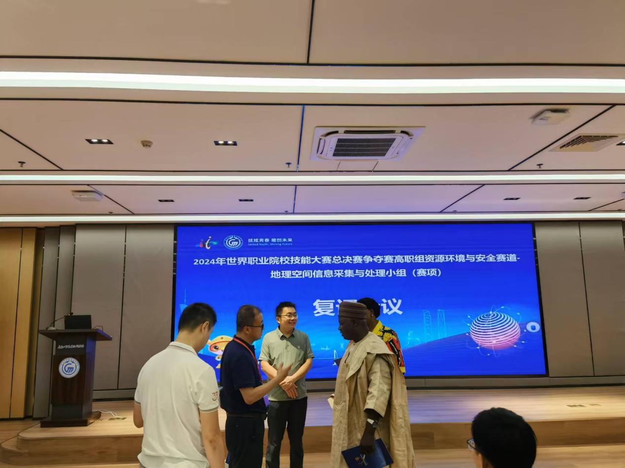 Kabir先生一行上午抵达学校后,受到了2024年世界职业院校技能大赛总决赛资源环境与安全赛道一(地理空间信息采集与处理小组)争夺赛工作人员的热烈欢迎,并与工作人员开心合照。随后,Kabir先生一行与完成裁判复评工作的裁判长——甘肃建筑职业技术学院党星海院长亲切交谈,就比赛开展情况进行了友好交流。