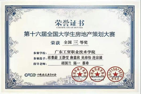 2024年11月15日—18日,由中国房地产业协会指导,中国建设教育协会主办,中国建设教育协会房地产专业委员会、首都经济贸易大学、北京建筑大学、亿翰物业服务研究院等承办2024年第十六届全国大学生房地产策划大赛总决赛在北京如期举行。测绘遥感信息学院学子不负众望,在指导老师的带领下获得本次大赛全国三等奖。