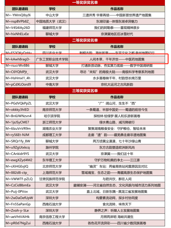 从本次竞赛获奖排名来看,本次比赛共400余组提交作品,测绘学院作品《《人间本草,千年济世》——中医药》地图集,从400余组参赛作品中脱颖而出,位列前10名。作品实力与武汉大学、中南大学、四川农业大学等本科院校参赛团队旗鼓相当。同时,我校也是唯一获得三等奖以上的职业院校。