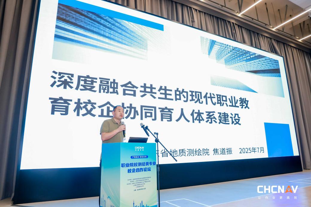 广东省地质测绘院广州分院院长焦道振在报告中进一步阐述了校企深度协作路径。他以“深度融合共生的现代职业教育校企协同育人体系建设”为题,分享了省地质测绘院通过校企实验室、产业导师团队等机制积极参与测绘遥感信息学院育人体系中的经验,为学院专业布局与产业需求研判、课程教材基地的共同开发建设、技术项目入校、人才专业培养等方面提供专业、行业思考,下一步将在此基础上更加紧密联系与建设,实现校企深度融合共生,也为现代职业教育校企协同育人体系建设提供可复制的“广东方案”。