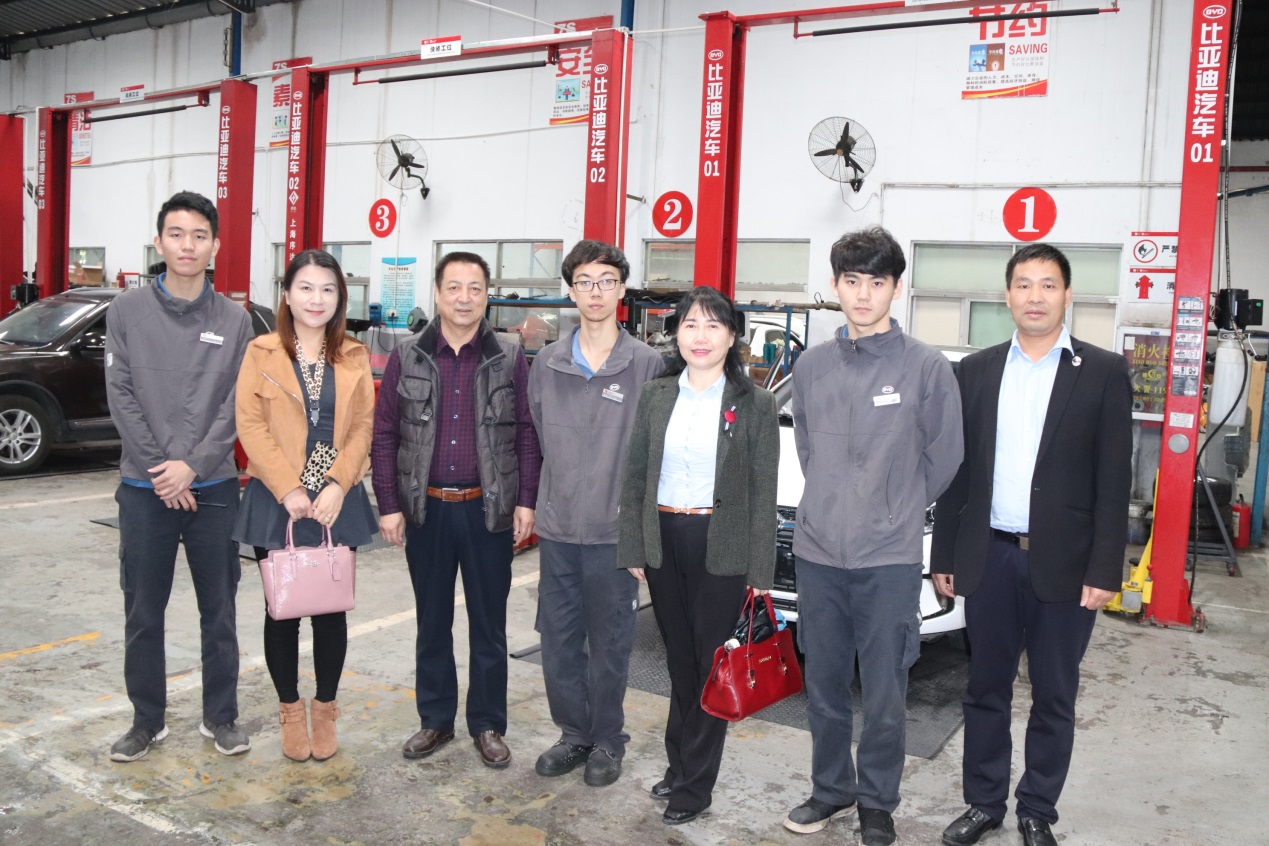 我校师生合影 教师代表团分上下午分别走访了深圳市龙南汽车贸易有限公司和深圳市恒泰昌汽车销售服务有限公司,分别受到深圳市龙南汽车贸易有限公司服务总监魏光辉和深圳市恒泰昌汽车销售服务有限公司客户经理明亮的热情欢迎。在走访过程中,双方就首期“比亚迪精诚英才培育班”学生到岗学习过程中的相关情况进行详细探讨,对教育教学过程中存在的问题相互交换了意见,并就第二期学员的到岗学习安排做出了规划部署。魏光辉总监和明亮经理在谈话中均表达了对我校学生综合素质和学习态度的肯定,并提出了与我校保持长期合作的意向,希望学校增加人才供给,助力企业发展。王艳芬院长在交流中提出,校企合作育人是一种双方共赢的模式,接下来学校将进一步加强与企业合作办学的育人模式,将“比亚迪精诚英才培育班”做下去,第二期培育班在第一期的基础上增加了三分之二的学生,将会给企业输送更多优秀的人才,希望企业方能够提前做好规划,合理安排,在确保学生安全的基础上引导学生积极参与到岗位学习当中,学思践悟,常学常新。 首期“比亚迪精诚英才培育班”在岗学习学生也向老师代表团介绍了日常的工作和生活情况,分享了到岗学习以来的各种心得体会。经过短短半年多的到岗学习,学生已经实现了从校园生活到社会生活的顺利过渡,并能将在学校里学到的知识有效地运用到日常工作实践当中,对汽车维修、日常保养、保险理赔等专业知识实现从理论学习到实践运用,取得了良好的学习效果。