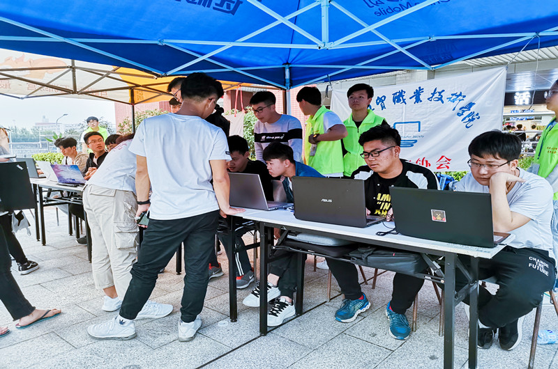在活动现场,拿着电脑来到现场的同学有很多,有的志愿者维持秩序,让同学们的问题及时得到解决,耐心讲解故障原因以及如何保养电脑;有的志愿者在校道向来往的学生宣传活动,让同学们更快清楚本次活动。在细雨绵绵的天气中,志愿者依然坚持接过每一台电脑,风雨无阻,在两天内共计修复电脑180多台,为同学们提供了很大的帮助。