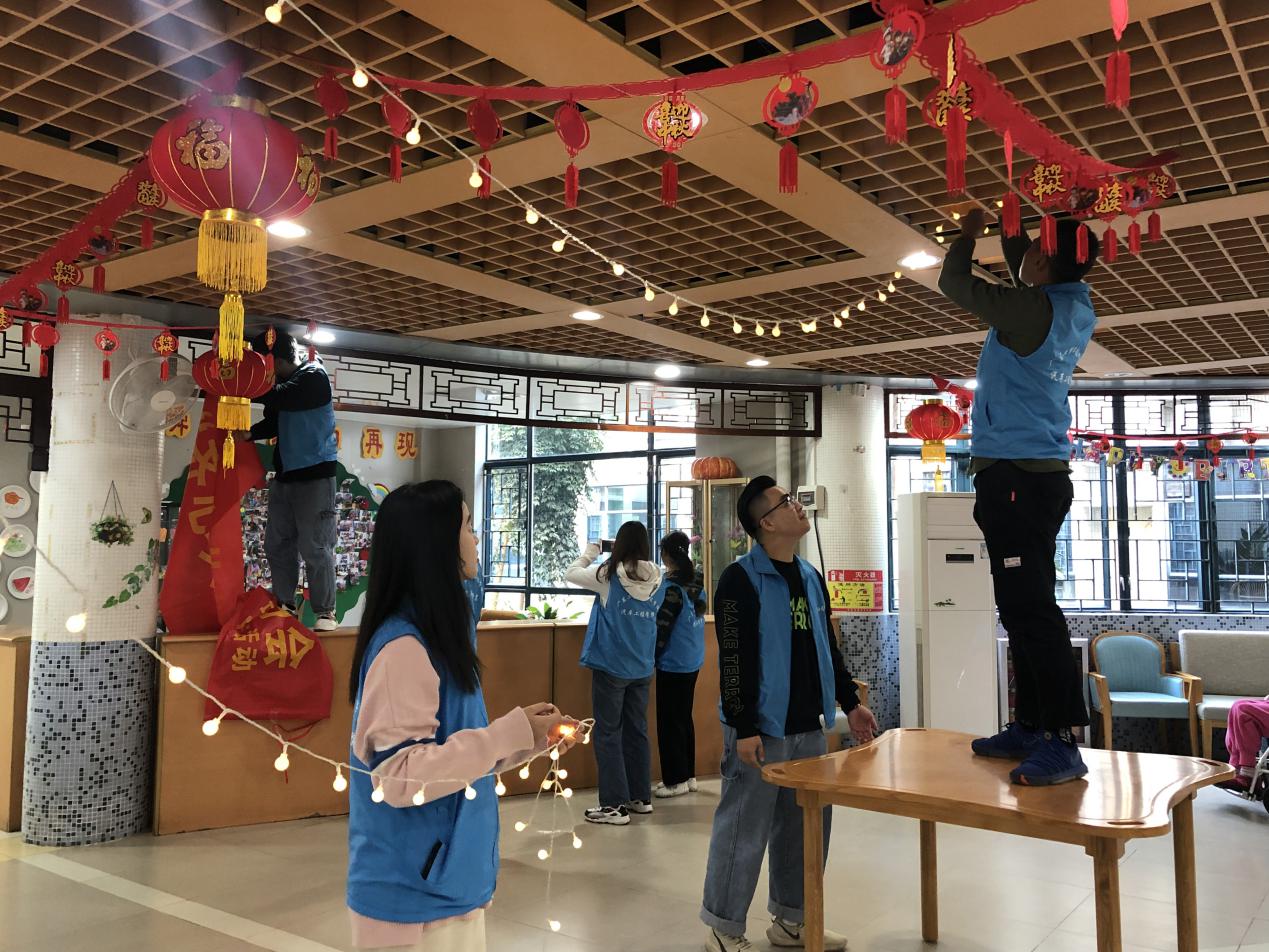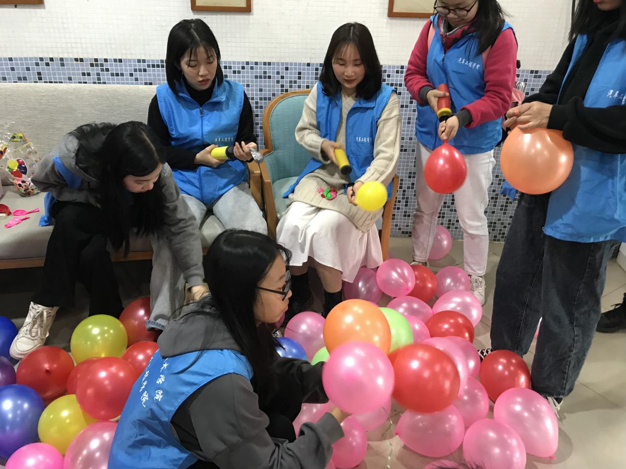 当天下午14:00,25名志愿者到达广州市老人院的慈慧楼。在老人院工作人员的指导下,志愿者们分成若干小组开始为生日会做准备工作。第一小组的志愿者们负责打气球,用气球将生日厅的环境变得更有氛围;第二小组的志愿者们则挂起横幅与彩灯等饰品,将生日会的氛围烘托得更加喜乐;第三小组的志愿者们到各楼层邀请老人们参加生日会。每个小组的志愿者们各司其职,将准备工作进行得井井有条。