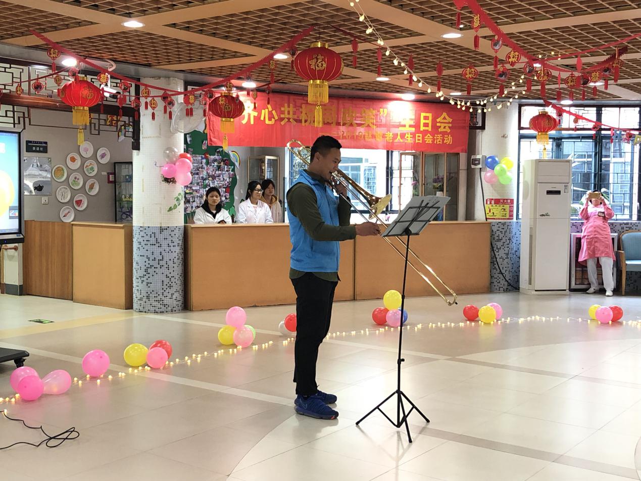 第二个节目是黄忠楠同志的长号独奏,演奏歌曲是《爱拼才会赢》,老人们面对长号的表演,都产生了浓厚的兴趣。有不少老人跟着演奏者的旋律摇摆起身子,试图加入这欢快而又紧张的节奏中。