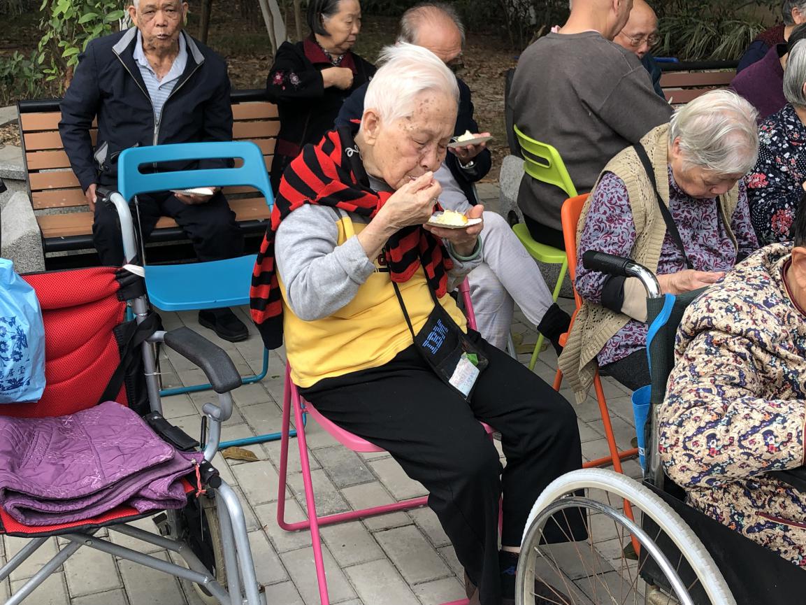 吃蛋糕的老奶奶 护工与志愿者将蛋糕均分后,送到老人手里,并给一些行动不方便的老人喂吃蛋糕,看着老人们因我们的帮助洋溢着笑脸的脸庞,志愿者们深有感触。
