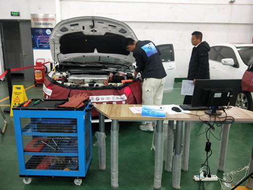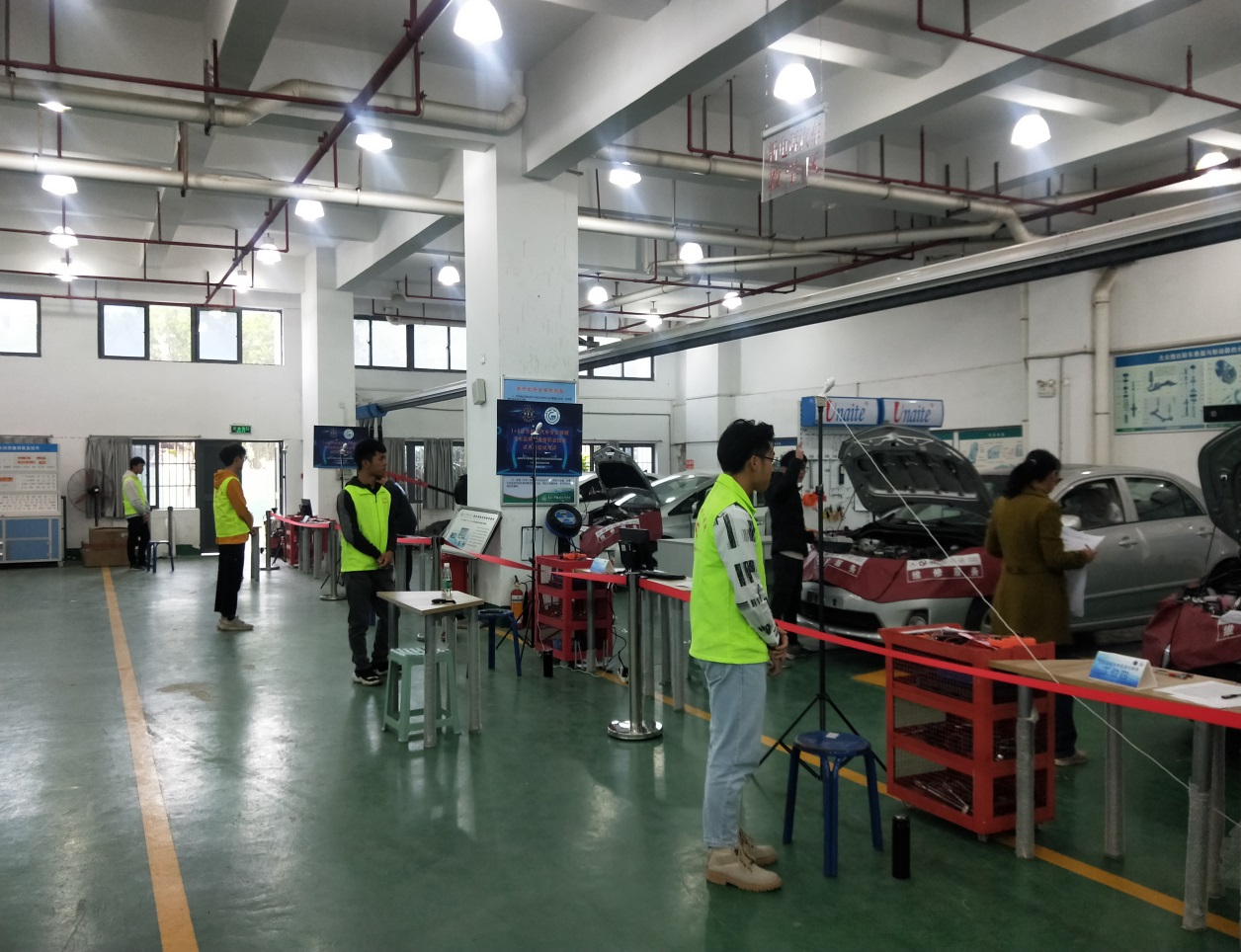 试考评现场 同时,学院注重师资培养,选派了侯益坤等8名老师到北京和广州接受专项培训,打造出一支专业的师资队伍。在此基础上,为保证考评工作高质量进行,汽车工程学院制定培训计划,8名培训教师分4组严格按照考评标准对学生进行了为期一个月的专项培训,高标准要求,为试考评工作顺利开展打下了坚实的基础。 经过紧锣密鼓的准备,12月22日上午八点,汽车运用与维修专业“1+X证书”试考评拉开了帷幕。考试全过程电子监控,有效备份各类数据,电力、网络等服务保障到位,考试秩序稳定良好。并且开放共享,接受多家企业、兄弟院校观摩。32名考生分两批有条不紊地参与考评,每名学生要在4个工位独立完成4个项目共计200分钟的操作技能考核。考核标准高、难度大。由于培训到位,考生基础扎实,考试中沉着应对,通过率达到了87.5%,居于全省试考评院校前列。参加考评的考生表现出了高超的技术和良好的职业素质。