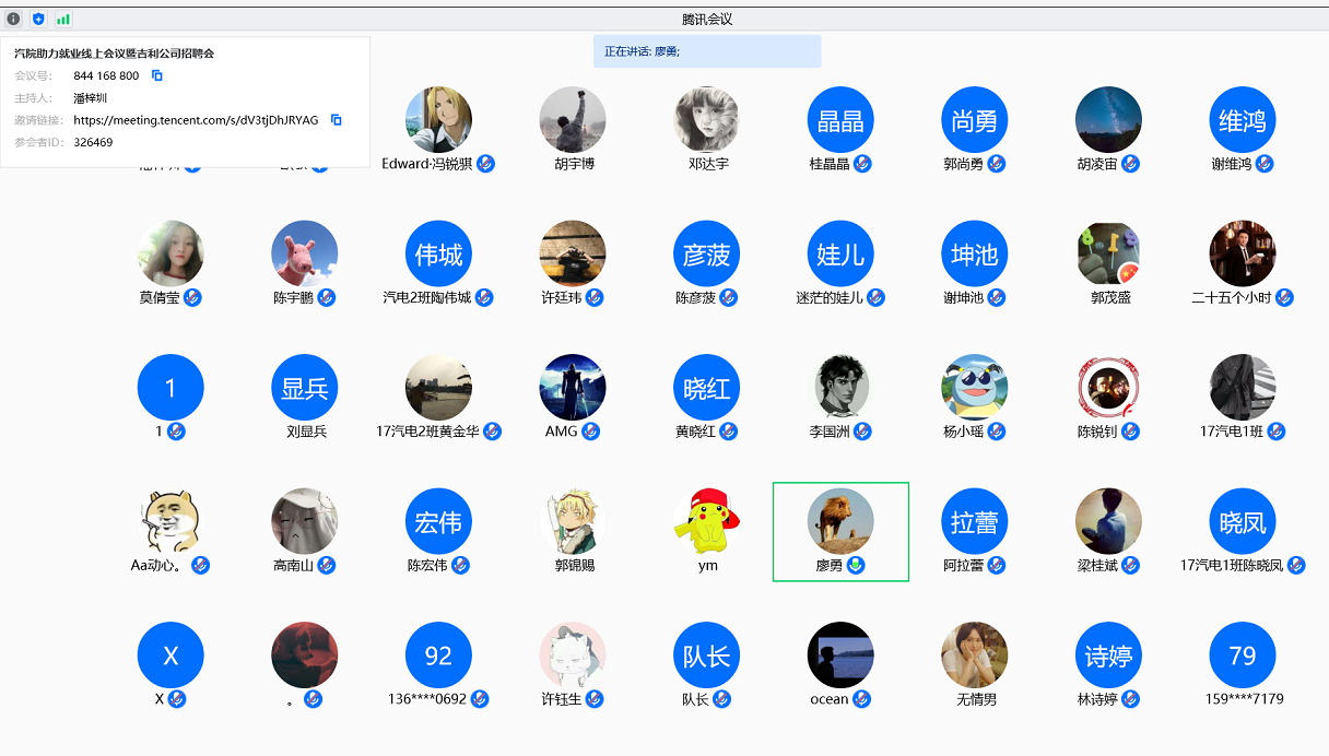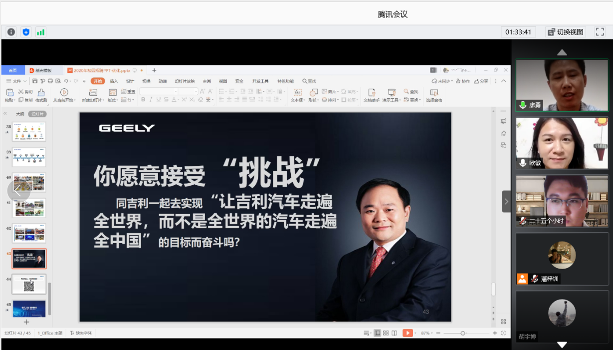 其次,廖勇经理向大家介绍了公司目前发展现状、优势条件、企业规模、未来发展规划等;对汽车工程学院开展的线上招聘表示感谢,同学们积极参加线上招聘会表示热烈欢迎紧接着马玺钧经理通过播放企业宣传视频等向同学们介绍了吉利控股集团本次招聘人才需求、岗位职责、薪资待遇、职位晋升等。会上设置交流互动环节,学生通过现场咨询和疑问解答等环节进一步加深对吉利控股集团的了解;最后有近30名同学投递简历,参加接下来的线上面试