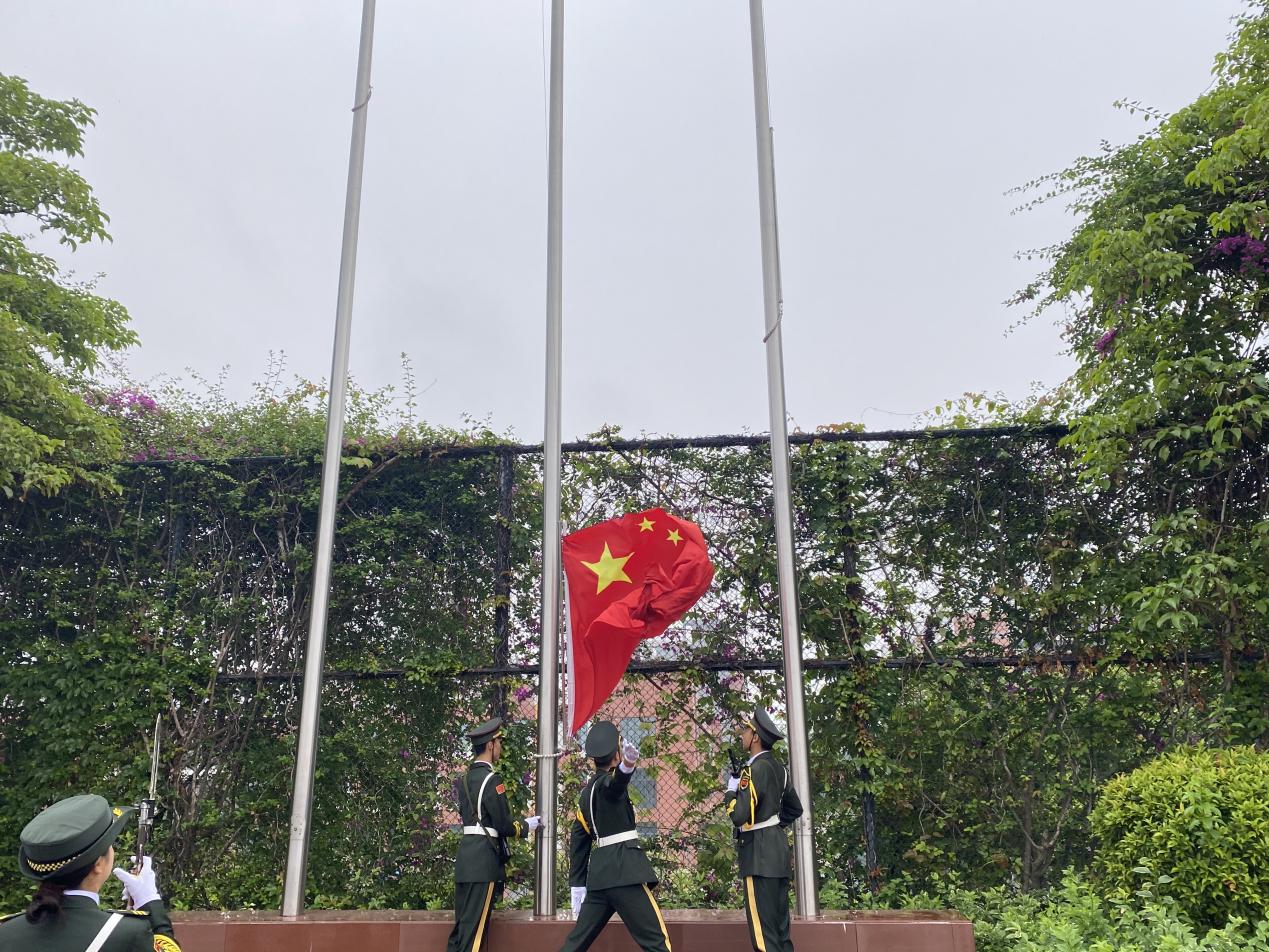 为迎接中国共产党建党100周年,深入开展爱国、爱党、爱社会主义教育,汽车工程学院于4月19日在白云校区田径场举行“升国旗 唱国歌 献礼建党一百周年”主题升旗仪式。汽车工程学院党总支书记彭卫东、辅导员陈宏伟及学院全体在校生参加了升旗仪式。 意气风发的国旗护卫队着装一致,迈着铿锵有力的步伐,护送鲜艳的五星红旗走向国旗台。伴随着激昂雄壮的国歌声,鲜艳的五星红旗冉冉升起,迎风飘扬。全体师生肃立,向国旗行注目礼;高唱国歌,向伟大祖国母亲献上最诚挚的敬意。