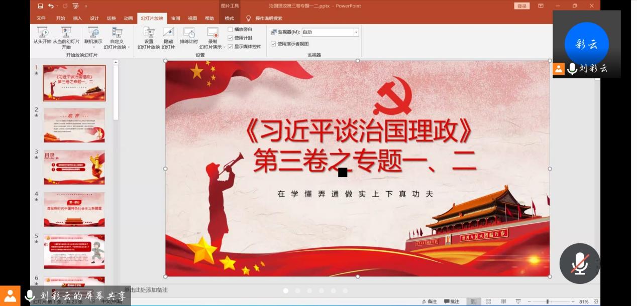 其次,刘彩云和大家一起学习了习近平总书记在中国共产党成立100周年大会上的重要讲话。习近平总书记的“七一”讲话高瞻远瞩、思想深邃、内涵丰富,通篇散发着解放思想、实事求是、与时俱进、开拓创新的思想光辉,是全党在新历史条件下的政治宣言,是党的重要理论创新成果,更是指引我们党奋力推进中国特色社会主义伟大事业和全面推进党的建设新的伟大工程的纲领性文献。学习好、宣传好、贯彻好习近平总书记“七一”重要讲话精神是当前和今后一个时期的一项重大政治任务,要原原本本读原文、认认真真悟原理,吃透精神实质、把握核心要义,确保学深悟透、融会贯通。
