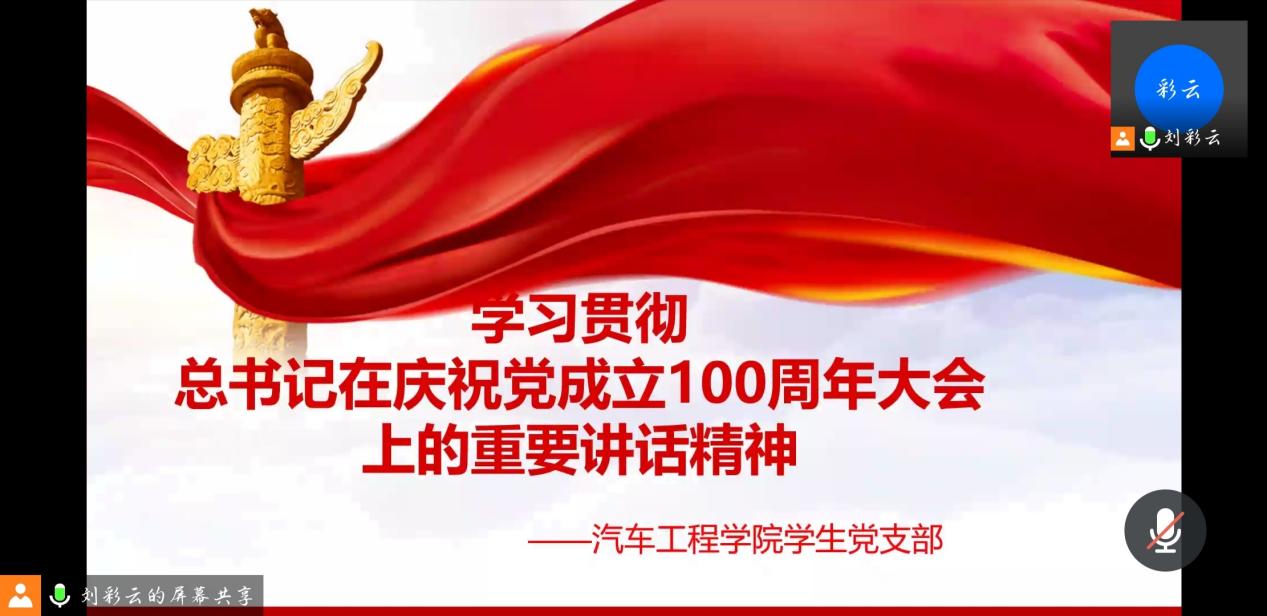 为学习宣传贯彻习近平总书记“七一”重要讲话精神,推动形成习近平总书记重要讲话、悟总书记重要思想的热潮,7月20日,汽车工程学院学生党支部在线上开展了党史学习微课堂之暑期专题学习班第一次专题学习。此次学习由学生党支部书记刘彩云主持,与会人员为支部全体党员。
