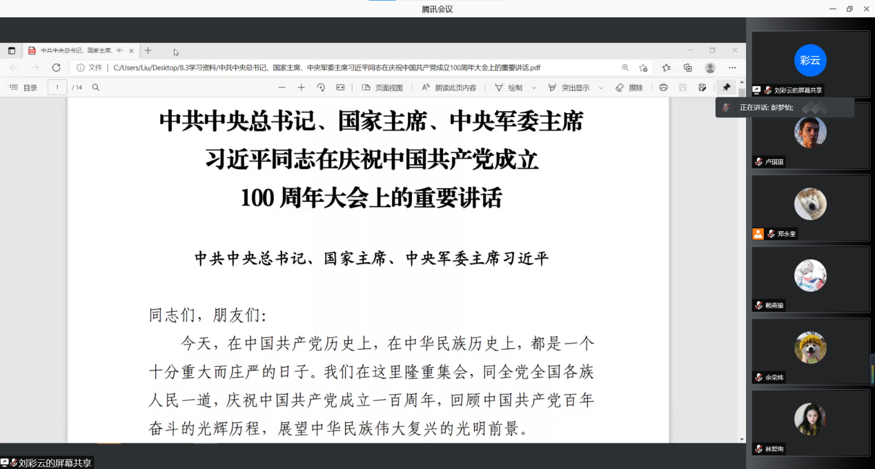 其次,刘彩云和大家一起学习了习近平总书记在中国共产党成立100周年大会上的重要讲话。习近平总书记的重要讲话,立足中国共产党百年华诞的重大时刻和“两个一百年”历史交汇的关键节点,全面回顾一百年来我们党围绕实现中华民族伟大复兴,团结带领中国人民开辟的伟大道路、创造的伟大事业、取得的伟大成就,庄严宣告我们实现了第一个百年奋斗目标,在中华大地上全面建成了小康社会,深刻总结了伟大建党精神,系统阐述了以史为鉴、开创未来的“九个必须”,是新时代中国共产党人不忘初心、牢记使命的政治宣言,是我们党团结带领人民以史为鉴、开创未来的行动指南。我们应该认真研读习近平总书记的讲话内容,深入领会讲话精神的重大意义和丰富内涵,准确把握核心要义和实践要求,全面理解百年奋斗取得的辉煌成就,深刻感悟百年奋斗凝结的伟大精神。