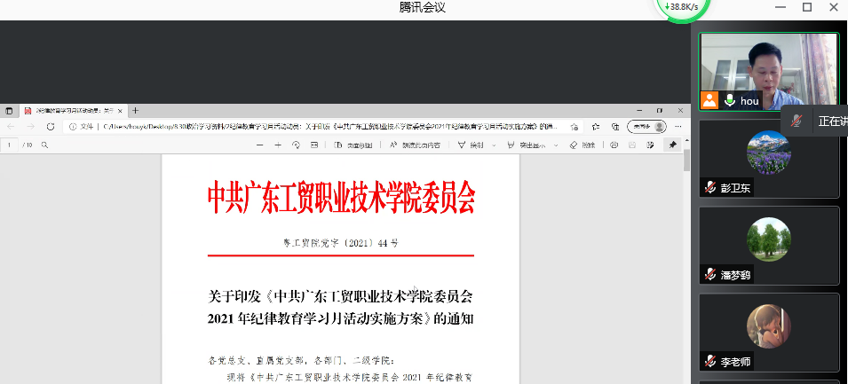 本次会议主要有以下几个环节:首先由侯益坤同志对教师第一党支部全体党员2021年纪律教育学习月活动进行动员,带领大家学习了学校《关于印发<中共菲律宾亚星222官网委员会2021年纪律教育学习月活动实施方案>的通知》,明确了纪律教育学习月活动学习主题、学习对象和时间安排、学习内容、学习形式 、学习要求及下一阶段的工作内容和重点,要求全体党员“学党史悟思想,守纪律铸忠诚”,要深入学习贯彻习近平新时代中国特色社会主义思想和党史,增强 “四个意识”、坚定”四个自信”、做到 “两个维护”;落实中央八项规定,坚决反对“四风”,强化党章党规党纪意识,在工作中廉洁自律。