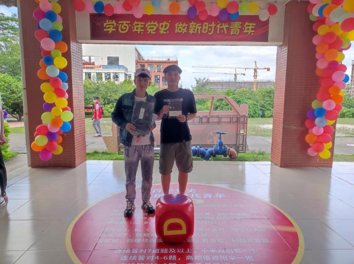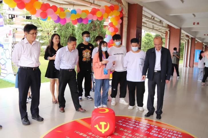 学校领导等一行人到现场指导工作及合影 今年恰逢建党百年,为营造浓郁的迎新氛围,汽车工程学院以建党百年为契机,在迎新工作中融入党史学习游戏,现场开展“学百年党史,做新时代青年”党史学习游戏活动,让新生在享受游戏乐趣的同时收获满满的党史知识。游戏设置党史人物、党史地点及党史事件等4套题,并设有奖品书包、雨伞、笔记本和钱包4类。学生现场通过投骰子的方式选择不同的题目,依次答题,并依据答对题目数量领取奖品。骰子设有校徽、党徽、A、B、C、D 6个面,其中A、B、C、D 4面代表4套题,校徽代表可以重新投1次,党徽代表可以从4道题中任意选择一套题回答。汽车工程学院通过党史趣味游戏引导汽车学院青年学子学党史、担使命,厚植爱国主义情怀,肩负起民族复兴大任!
