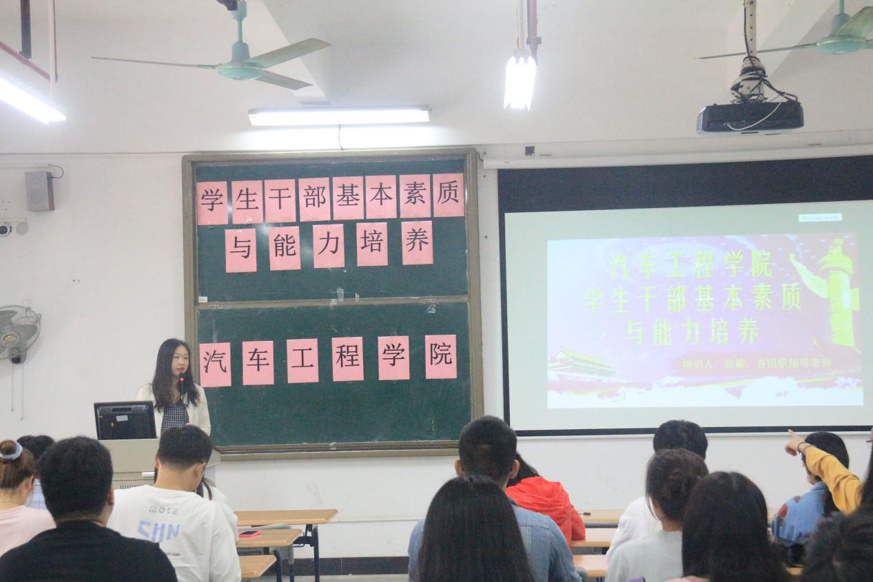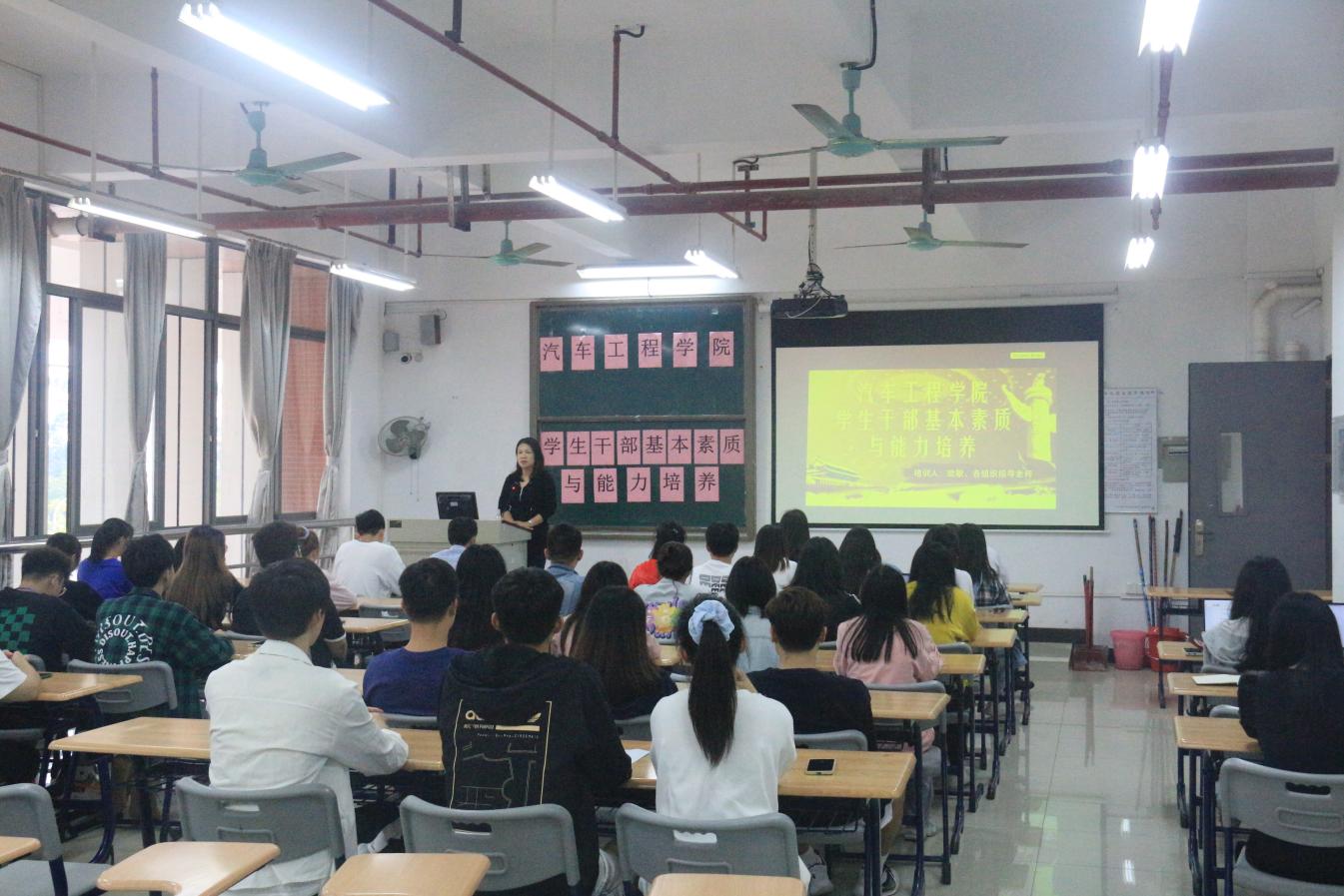 汽车工程学院党总支副书记欧敏讲课中 11月2日,第一期第一课在白云校区明德楼1-311召开,汽车工程学院党总支副书记欧敏担任此次培训会的主讲人。培训开始,欧敏表示了对学生干部工作的重视,然后针对活动组织方面进行了细致的讲授: 一是提前思考,做好事前策划。学生干部是协助学院以及老师的得力助手,许多重大活动都是由学生组织实施的,学生干部要学会提前思考,如何开展工作,怎样才能干得更好,这样才能进一步改进和创新。 二是分工明确,做好事中协调。老师与学生干部是一个团队,都是在为学院以及同学们服务,所以团队之间的合作能力会对学院的各项工作产生重大的影响,好的协调如同润滑剂,可使领导、老师与学生干部之间,以及各学生干部之间的关系更为融洽。