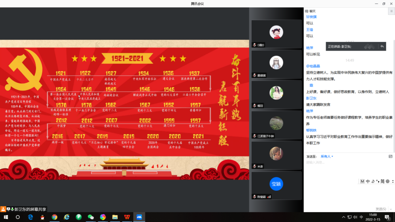 3月15日下午,汽车工程学院通过腾讯会议软件开展党总支书记讲党课活动。汽车工程学院党总支书记彭卫东以“中国共产党百年奋斗历程”为题,为全体教职工送上了一堂精彩的党课,汽车工程学院全体教职工参加了党课。