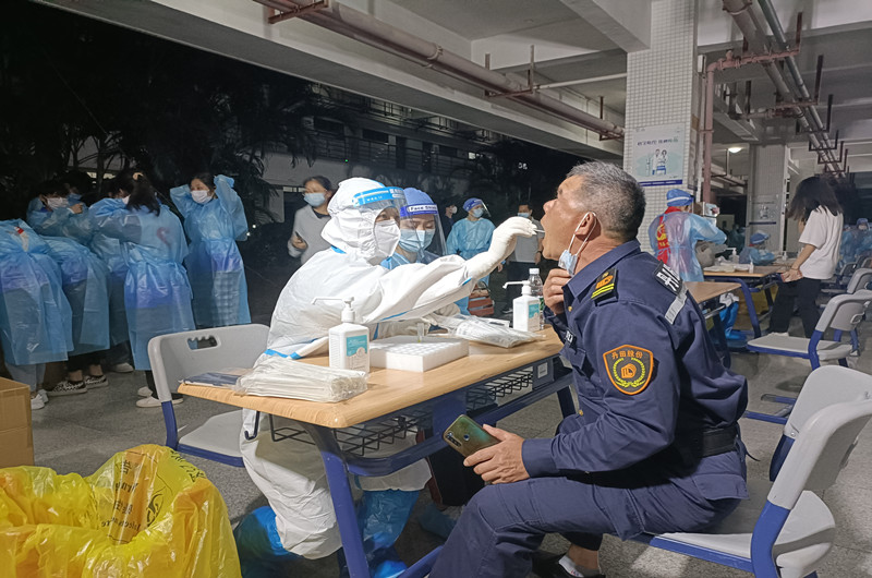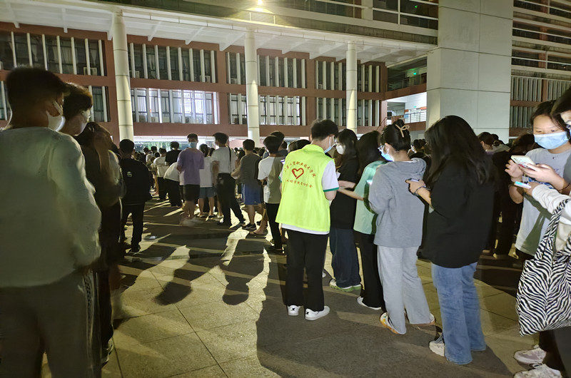 检测现场 为使此次活动高效进行,志愿者们早早来到活动现场进行培训分工,提前做好准备工作,等待医护人员的到来,以便在最快的速度开展此次活动。晚上21:00,检测工作正式开始。志愿者们迅速进入自己的岗位,开始紧张有序的工作。在现场引导师生有序排队,保持一米距离,为其测温、核实信息、发放检测试剂管等工作。医护人员全程穿戴医疗防护装备进行消毒洗手,通过咽拭子的方式为师生采集样本。接受核酸检测人员在此次检测活动中全程佩戴口罩,有序的采集并有序离开。
