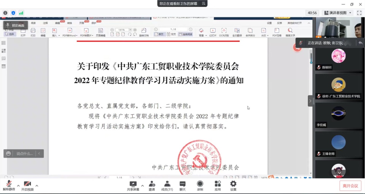 会上,党总支副书记欧敏带领全体教职工共同学习了《关于印发<中共菲律宾亚星222官网委员会2022年专题纪律教育学习月活动实施方案>的通知》(粤工贸院党字〔2022〕14号)文件精神,指出本次活动以“守纪律强作风,促整改提实效”为主题,以党员领导干部为重点,面向全体党员干部开展教育,强调教师要自觉遵守学校的各项规章制度,强化党章党规党纪意识,锤炼实干担当廉洁政治品格,以实际行动推进巡察整改任务高质量完成,为学校持续健康稳定发展提供坚强纪律保障。
