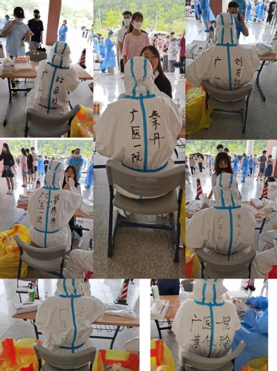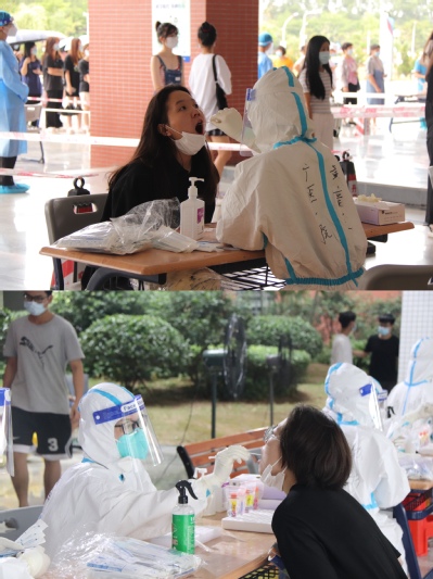 为确保师生生命安全,打赢疫情防控攻坚战,做好疫情防控常态化工作,根据学校相关安排,白云校区师生于4月29日开展全员大规模核酸检测工作。校领导、相关部门负责人、学工干部和辅导员以及学生安全志愿队等并肩作战、高效协作,形成战疫共同体,全面助力核酸检测,筑牢学校疫情防控安全线。“天使白”,吹响“出征号” 在校园里,有一群“天使白”,他们身穿“战袍”,就像守卫健康的大白一样,守护大家平安上岸。穿上白色的“战袍”,被遮挡的严严实实,无法分辨他们是谁。但是他们闻令而动、听令而行、义无反顾、日夜奋战,一直默默的冲在疫情防控的前线,与病毒赛跑,用生命守护生命。他们因长时间佩戴护目镜和口罩,摘下口罩的瞬间,脸上写满了忙碌与疲惫;哪怕长时间工作导致浑身衣服湿透,但他们仍继续埋头苦干,直至完成学校所有师生核酸采样。正如《祖国不会忘记》歌词里表述的:在茫茫的人海里我是哪一个,在奔腾的浪花里我是哪一朵,在征服宇宙的大军里,那默默奉献的就是我,不需要你认识我,不渴望你知道我,我把青春融进祖国的江河,山知道我,江河知道我,祖国不会忘记我.......