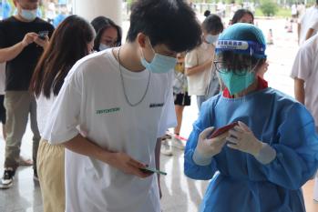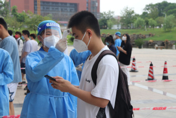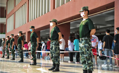 图2 医务人员给学生做核酸 “迷彩绿”,吹响“集结号” 在学校各宿舍楼下和核酸检测地点,有一批身穿“迷彩绿”的安全志愿队。他们手持“大声公”,吹响核酸检测“集结号”,分批有序带领学生前往核酸检测点,是校园里一道亮丽的风景线。他们虽是退役军人,但退役不褪色,抗疫显担当,在校园疫情防控工作中完美诠释军魂。