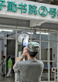 图3 安全志愿队手持“大声公”喊学生下楼集结做核酸