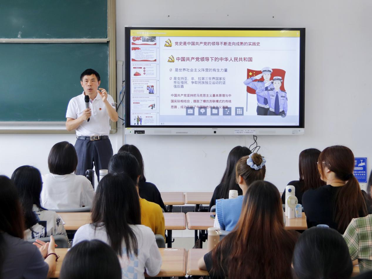 党总支书记彭卫东正在讲党课 彭卫东书记首先向同学们介绍了“四史”:党史、新中国史、改革开放史以及社会主义发展史,图文并茂、生动形象地解说了“四史”之间的逻辑关系,引导学生深刻认识到“四史”是中国共产党为人民谋幸福、为民族谋复兴、为世界谋大同的实践史,中国共产党的领导是“四史”的主线。