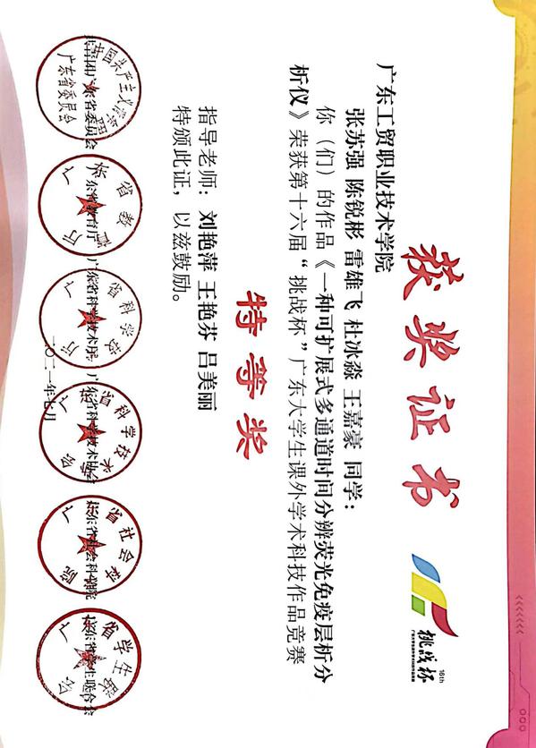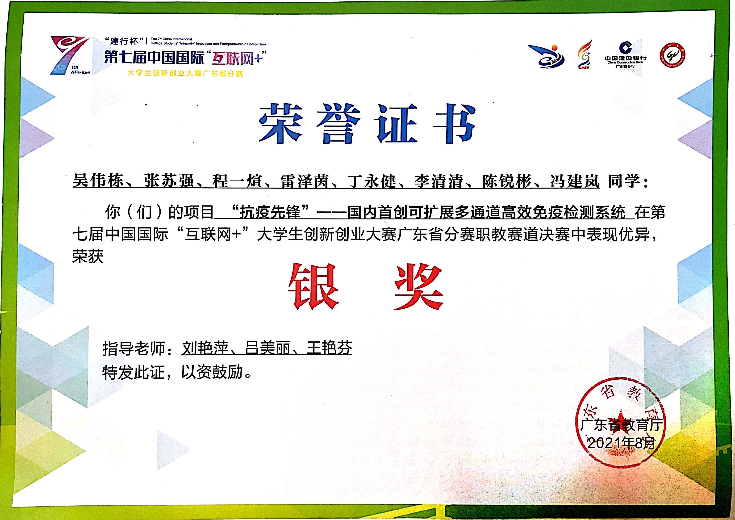 第十六届“挑战杯”广东大学生课外学术科技作品竞赛特等奖证书 在校期间,张苏强通过以赛促学的方式不断提高自身职业技能水平。2021年7月,创作《一种可拓展式多通道时间分辨荧光免疫层析分析仪》作品获得了广东省第十六届“挑战杯”广东大学生课外学术科技作品竞赛特等奖。追梦的路上从来没有止步,为了在专业学习的道路上不断前行,张苏强积极参加第七届中国国际“互联网+”大学生创新创业大赛,最终获得第七届中国“互联网+”大学生创新创业大赛广东省决赛银奖优异成绩。其作品《“抗疫先锋”—一种可拓展多通道高效免疫检测系统》在疫情肆虐的情况下积极响应了“逆行者”精神的号召,为抗击疫情贡献了自己的一份力量。