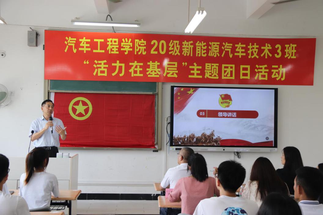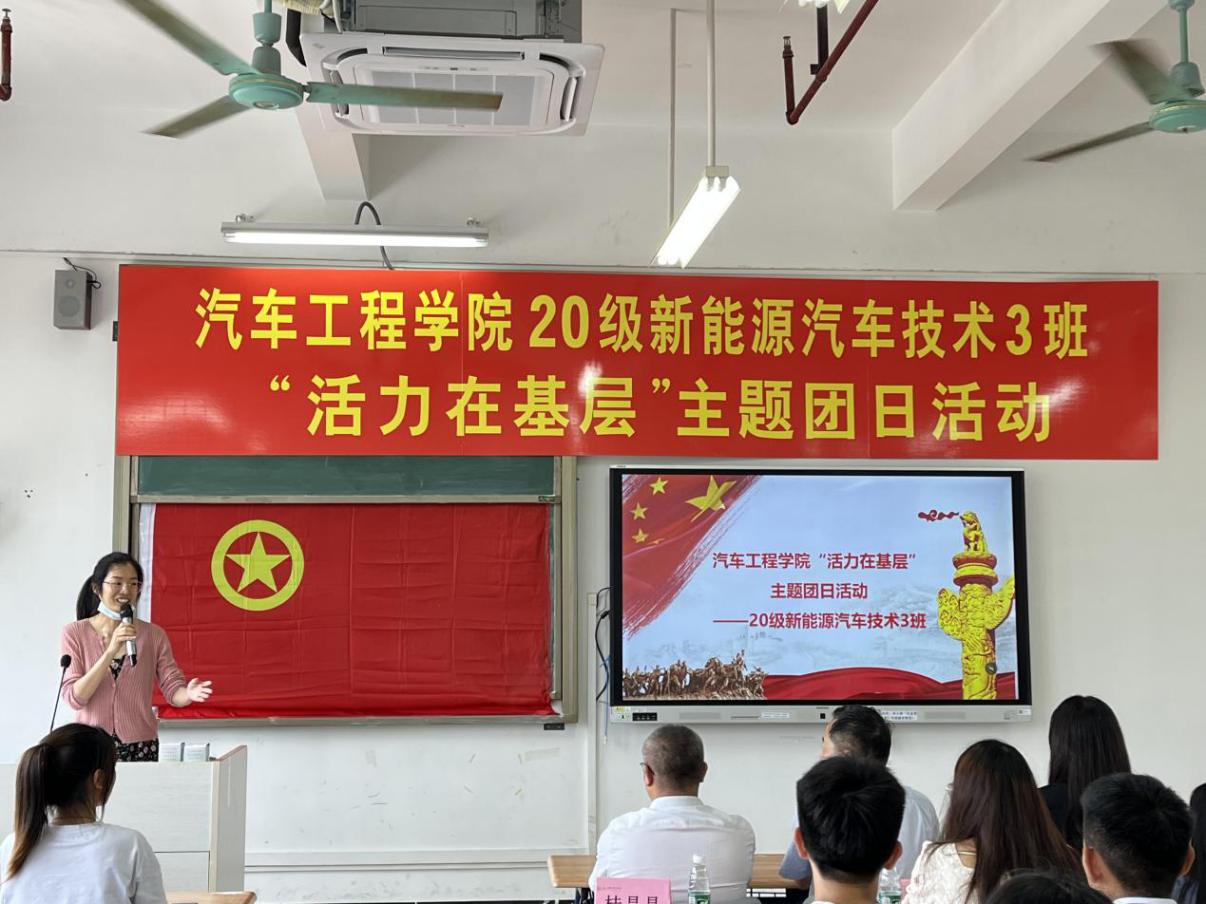 为深入学习习近平总书记关于共青团“奋进新征程、建功新时代”的重要思想,引领团员青年深刻感悟“两个确立”的决定性意义,增强“四个意识”、坚定“四个自信”、做到“两个维护”,以实际行动迎接党的二十大,庆祝建团百年。6月15日下午,汽车工程学院在明德楼1区406教室开展20新能源3班“活力在基层”主题团日活动。学校副校长杜汉清、汽车工程学院党总支副书记欧敏、辅导员陈莹颖、陈宏伟、詹琪琪、郭静文、周名力以及20新能源3班全体成员参加活动。活动由班主任桂晶晶主持。