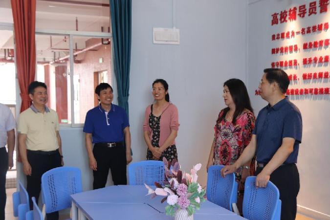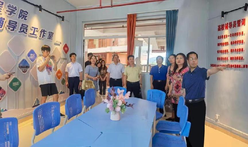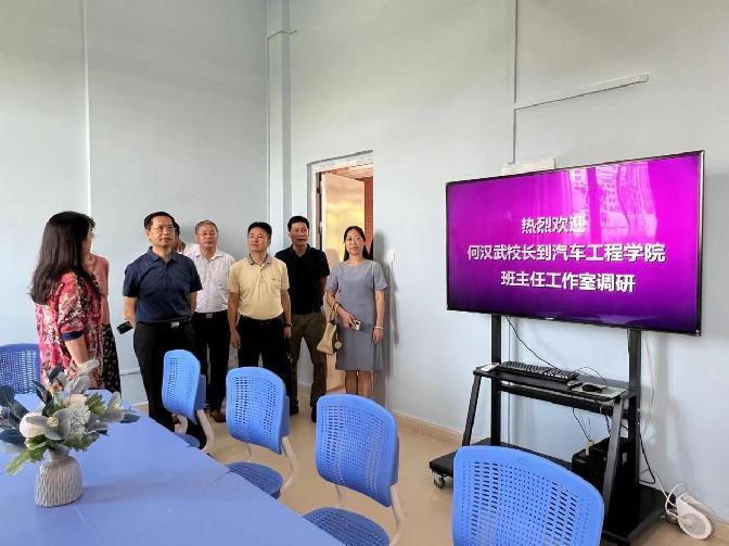 为深入学习贯彻习近平总书记关于高校思想政治工作的重要论述,破解大学生思想政治教育工作中的重点、难点问题,建设一支“专心、专注、专业、专情”的班主任队伍和辅导员队伍。汽车工程学院大力推进班主任工作室与辅导员工作室的建设工作,营造良好的育人氛围。6月24日下午,校长何汉武、副校长陈珊兴、校办主任吴浩、工会常务副主席赖明瑛等一行在汽车工程学院党总支书记彭卫东、党总支副书记欧敏、副院长潘梦鹞等人的陪同下到我院实地考察班主任工作室、辅导员工作室及德育案例工作室的建设情况。 何汉武校长等一行人参观汽车工程学院班主任工作室