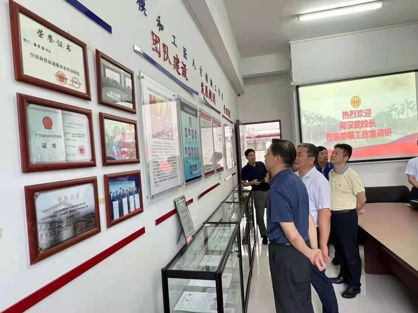 6月24日下午,学校党委副书记、校长何汉武,副校长、工会主席陈珊兴到“潘梦鹞劳模与工匠人才创新工作室”开展建设调研。校办主任吴浩、工会常务副主席赖明瑛、工会副主席李伟民、汽车学院党总支书记彭卫东、党总支副书记欧敏和“潘梦鹞劳模和工匠人才创新工作室”主要团队成员参加了调研活动。本次调研工作是在6月9日陈珊兴带队调研工作室的基础上再次深入调研,充分展现学校领导对劳模工作室的重视和关心,对“潘梦鹞劳模与工匠人才创新工作室”的深入发展具有里程碑意义。