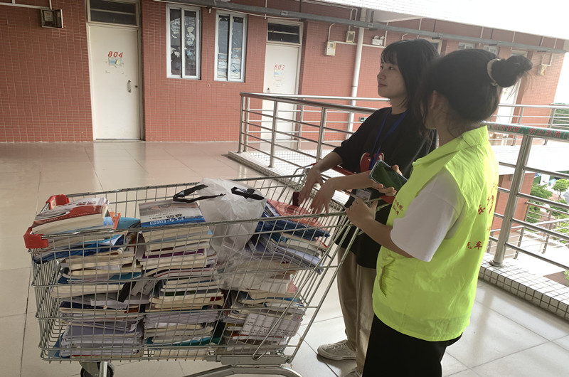 志愿者们上门收书 为保证此次活动的顺利开展,上午十一点半,汽车工程学院青协分会志愿者们提前来到现场布置好摊位,为活动的开始做好准备。在志愿者们热情的宣传下,越来越多的同学带着自己的闲置物品来到摊位前。考虑到毕业生物品太多带不了到摊位的问题,志愿者们按照分配来到各个毕业班的宿舍收集物品,许多同学都怀着一颗爱心,捐出充满爱意的物品。